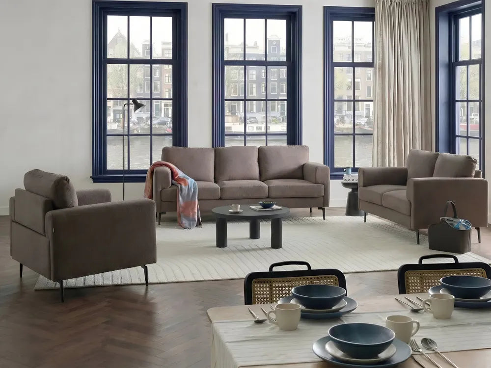 This stylish 3-seater sofa features a clean, simple silhouette with deep, comfortable cushions and wide track arms, perfect for lounging and relaxing. Its durable upholstery in a shade of brown adds a soft, natural touch to any modern or transitional living space. Supported by sleek black metal legs, this sofa offers a refined, airy look that blends effortlessly with contemporary décor.