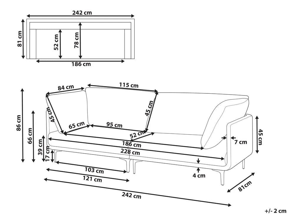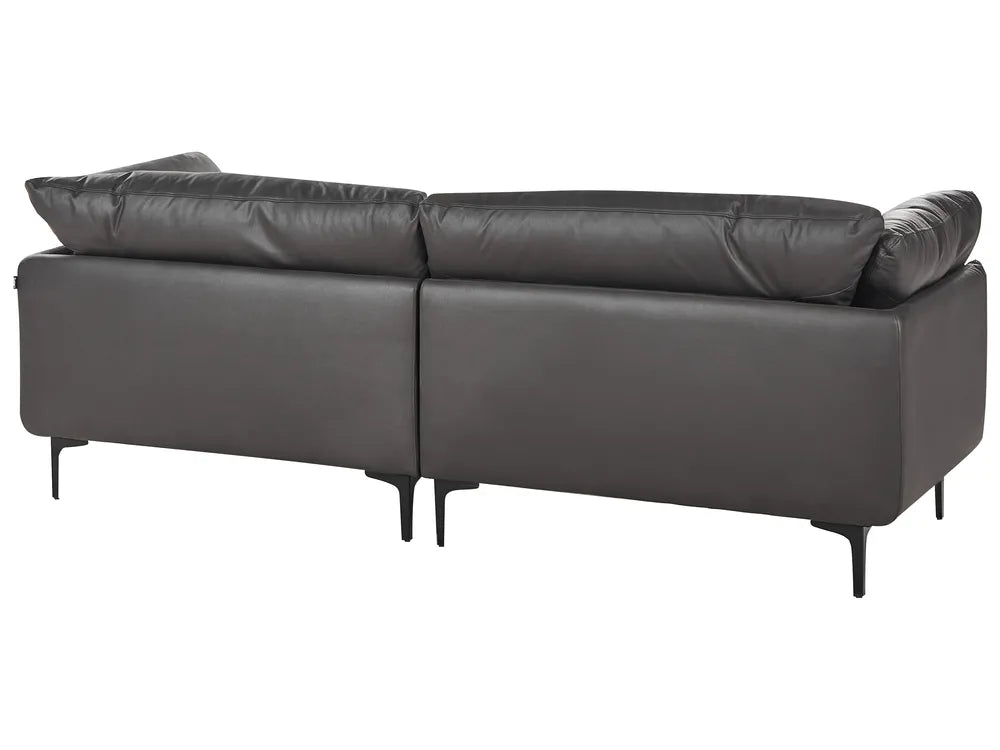 Elevate your living space with this sleek and elegant sofa, designed to be the perfect centrepiece for interiors inspired by modern or industrial style. Upholstered in durable, low-maintenance vegan leather, it offers comfortable seating for three people and the sturdy metal legs provide stability while adding a stylish touch. The additional small cushions guarantee extra support for a truly relaxing experience.