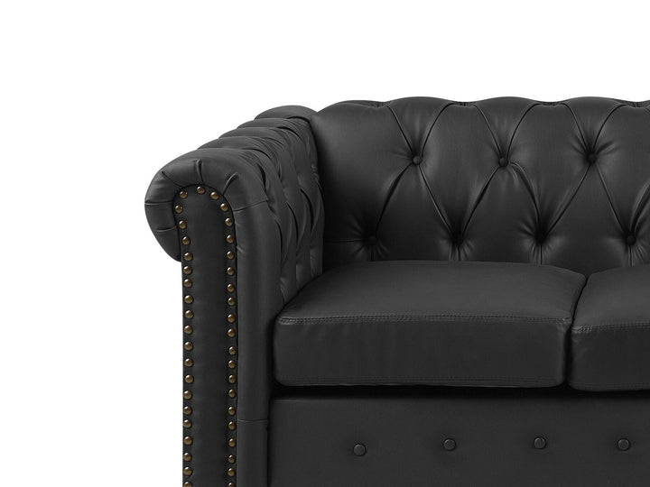 This elegant sofa with a classic Chesterfield design is a perfect highlight for interiors in vintage, retro, or glam decor. Its sturdy, wooden construction features soft to the touch and durable faux leather upholstery in classic black. The scroll armrests, embellished with nailhead trim, beautifully complement the buttoned backrest and its diamond stitching, while the eucalyptus wood legs grant a minimalist touch to the piece. The highest level of comfort is reached thanks to three generously padded seat cushions, which give a touch of luxury to the sofa. The seat cushions feature a removable cover that translates to easy cleaning without a worry for stains.