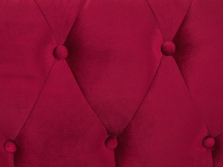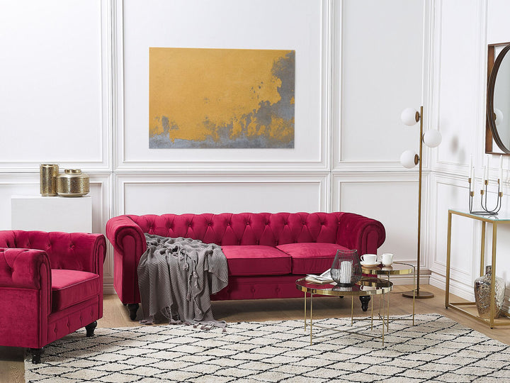 Characterized by a sleek silhouette with wide scroll arms, this 3-seater features an iconic Chesterfield style that suits any modern or traditional interior. The low backrest, thickly padded seat cushions as well as ornate rubberwood legs provide the best sitting comfort and stability. Upholstered in a velvet fabric in a luxe shade of red, the seats present classic diamond button tufting. This English classic is easy to care for and looks great with any home decor, modern or traditional.