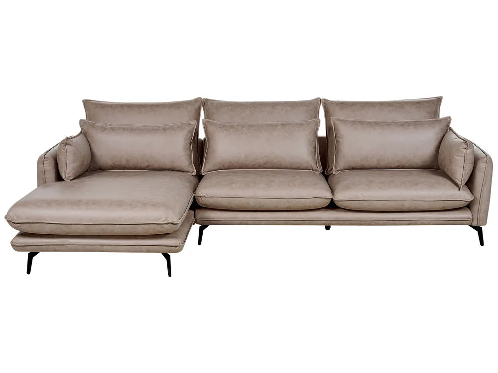 This corner sofa is going to quickly become your favourite lounging spot in your home. Crafted out of sturdy polyester, the piece is characterized by its durability and easy maintenance. What is more, its faux suede upholstery, and the light brown shade of the sofa makes the piece easy to match with a variety of interior decor styles. The couch also comes with extra scatter pillows to elevate your comfort to another level during use.