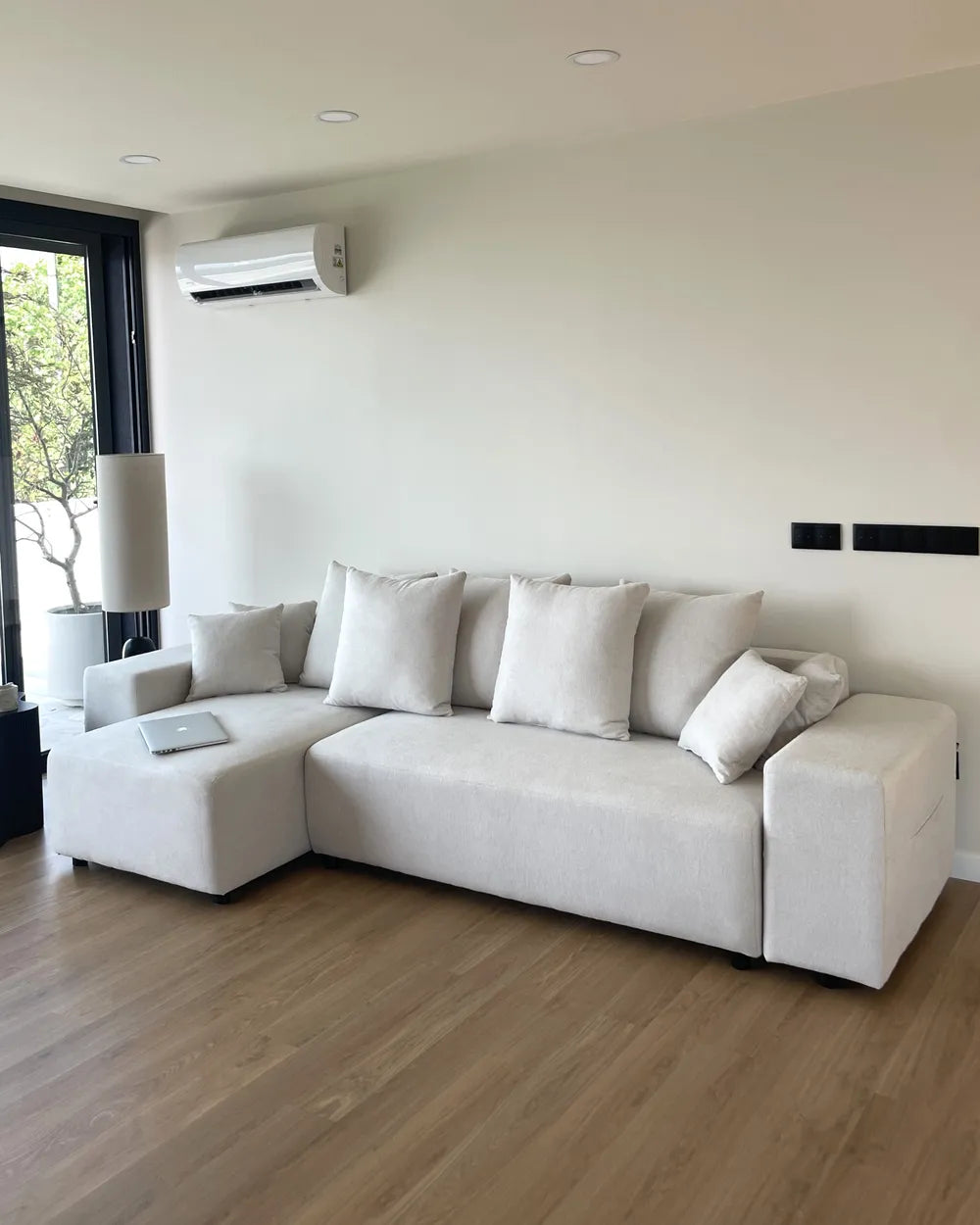 Upgrade your living space with this stylish and functional corner sofa. Upholstered in sleek and resilient fabric, it exudes elegance and longevity. Supported by a sturdy wooden frame, it seamlessly transforms into a cosy bed, ensuring versatility for any occasion. With integrated storage, conveniently stash away extra bedding without sacrificing space. Ideal for modern living rooms or bedrooms seeking a chic yet practical touch, this sofa embodies both comfort and sophistication.