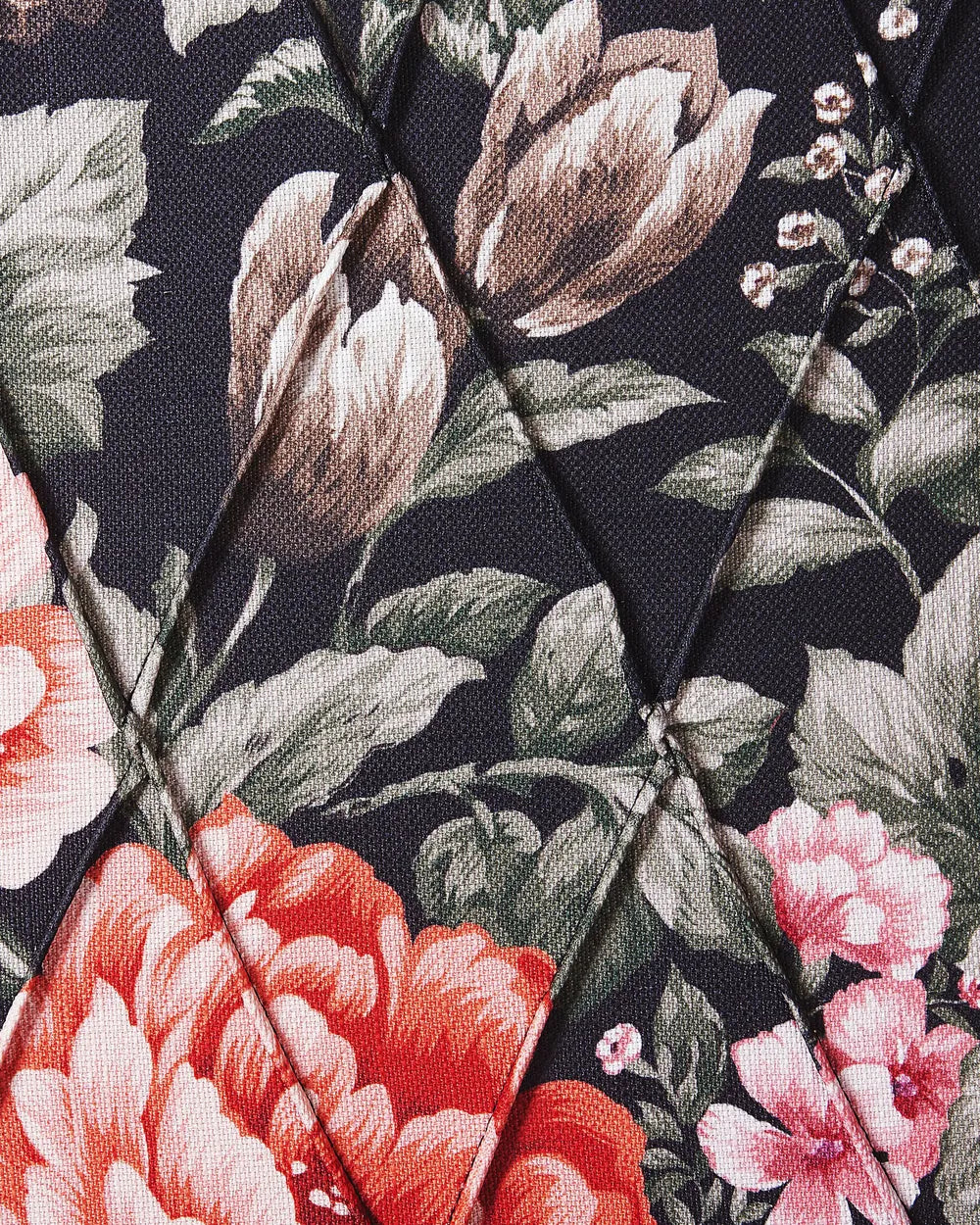 Transform your living room effortlessly with a beautiful armchair decorated with a vivid floral pattern on a black background. The piece is versatile and will blend well with every decor scheme. A fitting square footstool will help you relax after especially stressful days. The armchair has a thickly padded seating which makes sitting a pleasurable experience. Legs and frame made of solid wood improve the overall stability and guarantee durability.