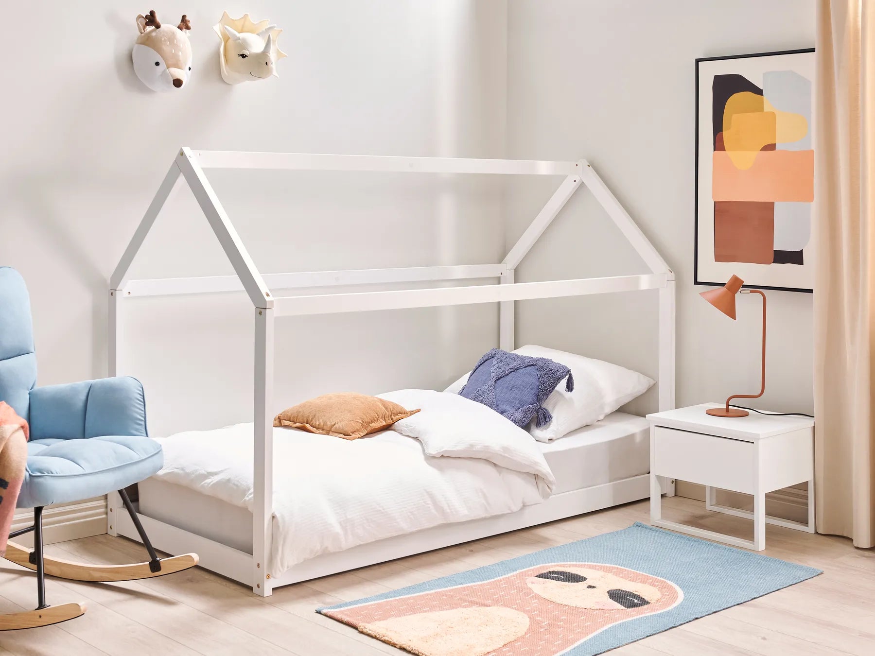 This lovely house-shaped bed will be a dream come true of any child. Made from pinewood, the frame features a low-profile, ensuring easy accessibility and safety for toddlers. The included slatted bed base fits a single size mattress, offering stable support. The playful design of the bed sparks imagination and endless fun, making bedtime a joyous adventure.