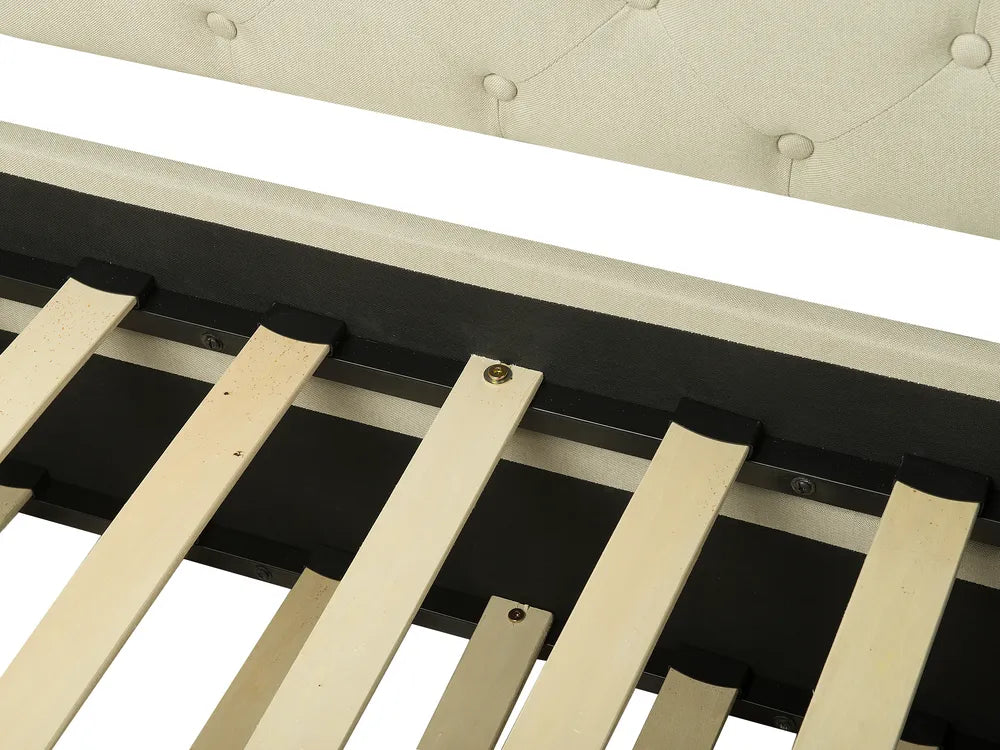 This trundle bed, inspired by the forms of Chesterfield, combines both functionality and style. Tailored in soft-to-the-touch linen polyester upholstery, the bed features vintage-style decorative button tufts which match seamlessly with interiors in retro and traditional decor. The durable slatted base allows for even body weight distribution for healthy and undisturbed sleep. The bed can provide an added sleeping surface with a single pull, which comes in handy when hosting a sleepover.