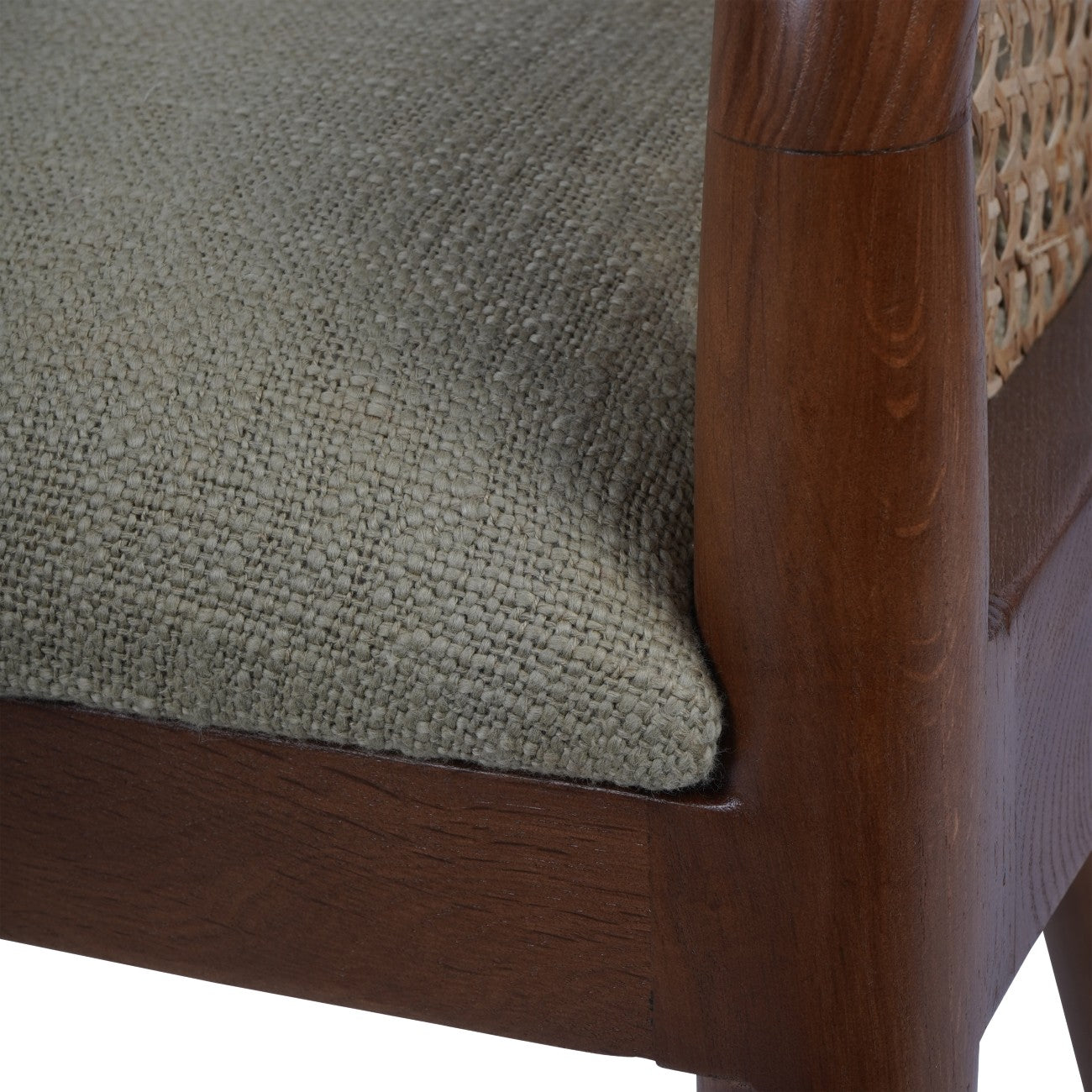 Crafted with a solid oak frame, the chair features beautifully hand-woven cane detailing within its softly rounded back and sides, adding texture and visual interest. The seat is upholstered in a luxurious soft slub fabric, providing a comfortable and refined finish that brings a modern twist to this classic silhouette.