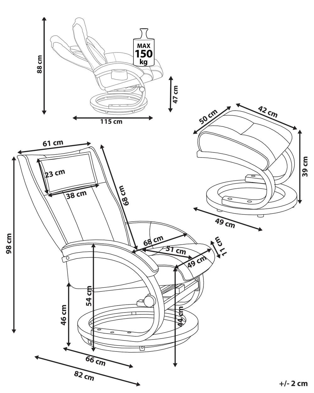 This smartly designed recliner with a footstool offers 3-point massage in 5 modes as well as the heating function for 2 areas, with all being easy to use with the included remote. Upholstered in an elegant faux leather that is soft to the touch. The chair features plush padding, high back, curved armrests and a head cushion guaranteeing long, comfortable sitting. Suitable for all modern or traditional interiors, living rooms, study rooms offices.