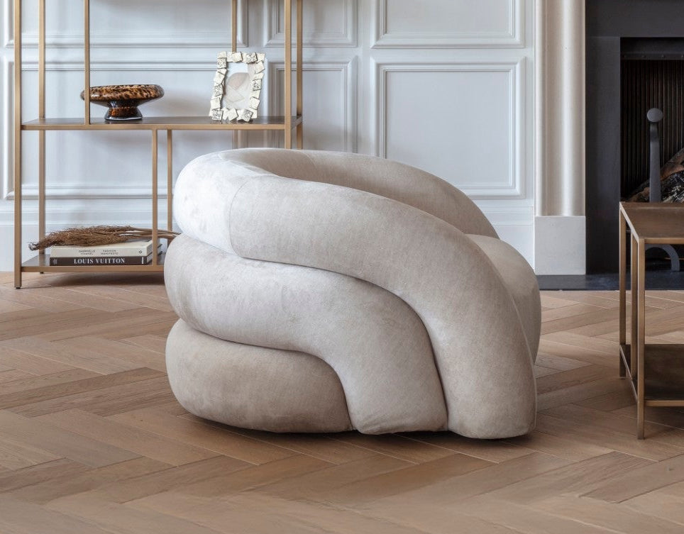 Beige armchair with a unique, curved design on a white background