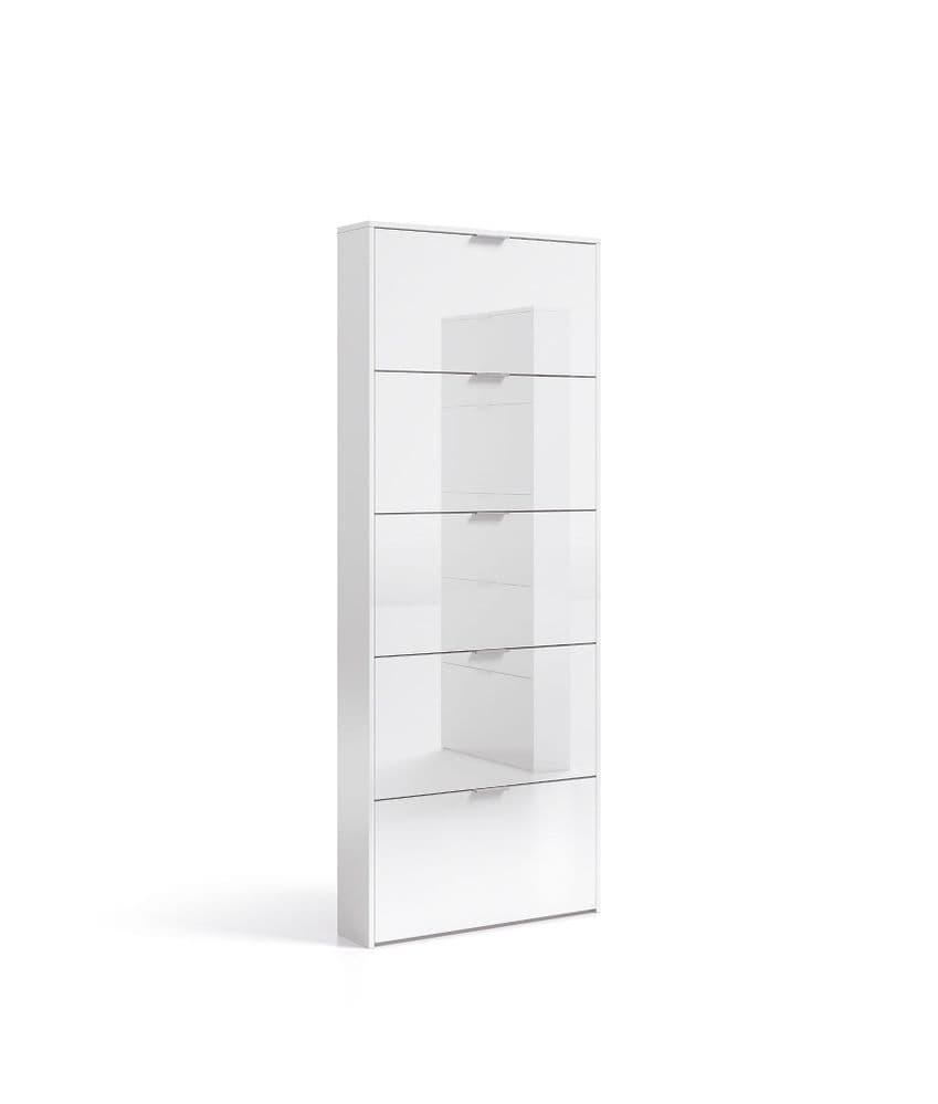 A modern and unique shoe storage cabinet stacks shoes neatly into drawers with an easy opening. The cabinet has three broad drawers. Each drawer of the shoe storage cabinet contains metal baskets inside to store shoes. This modern shoe storage cabinet is in a lacquered high-gloss finish and can be a great addition to any modern and contemporary living room, hallway or bedroom. The metal and gloss white detailing offers unique combination to the shoe storage cabinet.