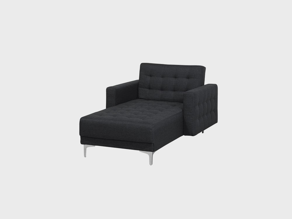 This modernised chaise lounge provides comfortable seating as a daybed with its reclining backrest. Fully upholstered in high-quality, stylish graphite grey fabric and elegant tufting, it seamlessly blends with any interior colour scheme. Its modular design allows for it to be combined with other pieces from the collection to create the seating arrangement of your dreams. The whole piece is kept stable thanks to metal legs.