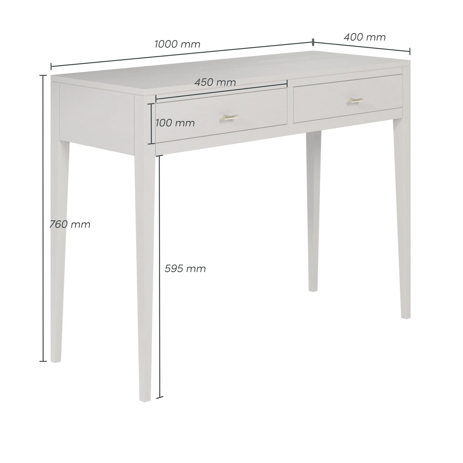 Two spacious drawers glide smoothly on metal runners, offering convenient storage for keys, mail, and everyday essentials. Round metal handles and gently tapered legs add a refined finishing touch.