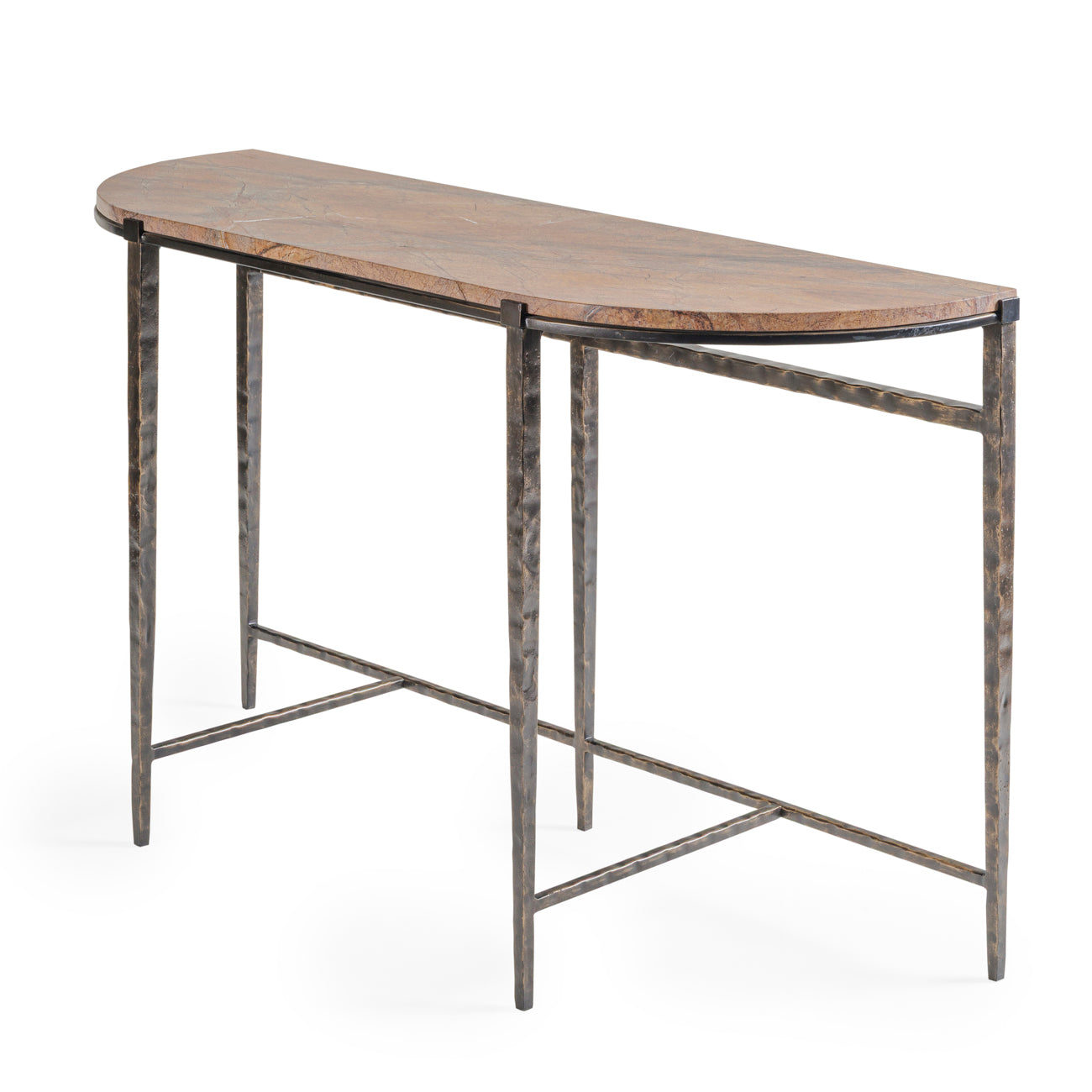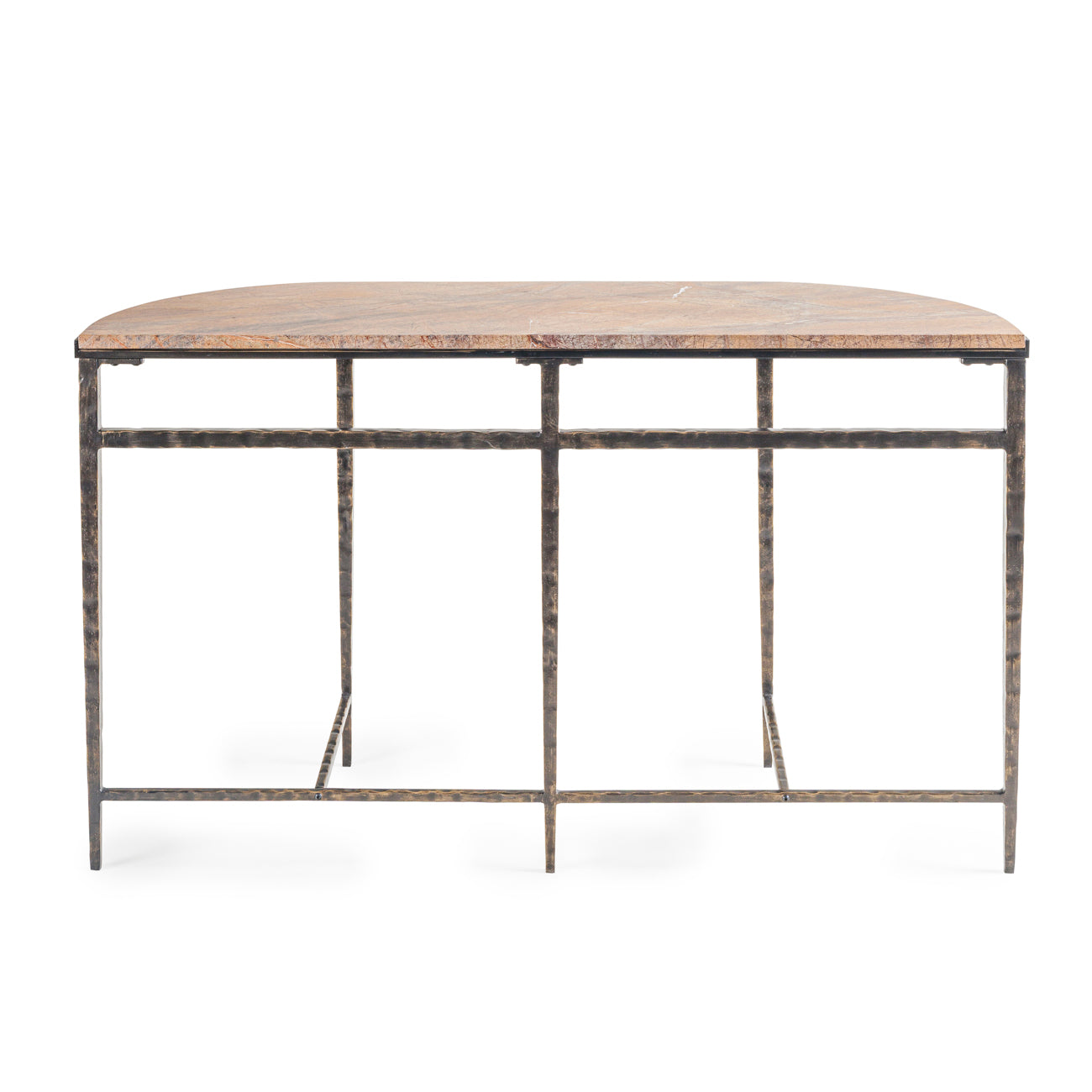 Featuring a semi-circular forest brown marble top, each piece showcases unique veining and tonal variations, ensuring every table is truly one of a kind. The marble surface is supported by a hand-forged iron frame, finished in a deep gilded bronze that adds warmth and understated luxury.