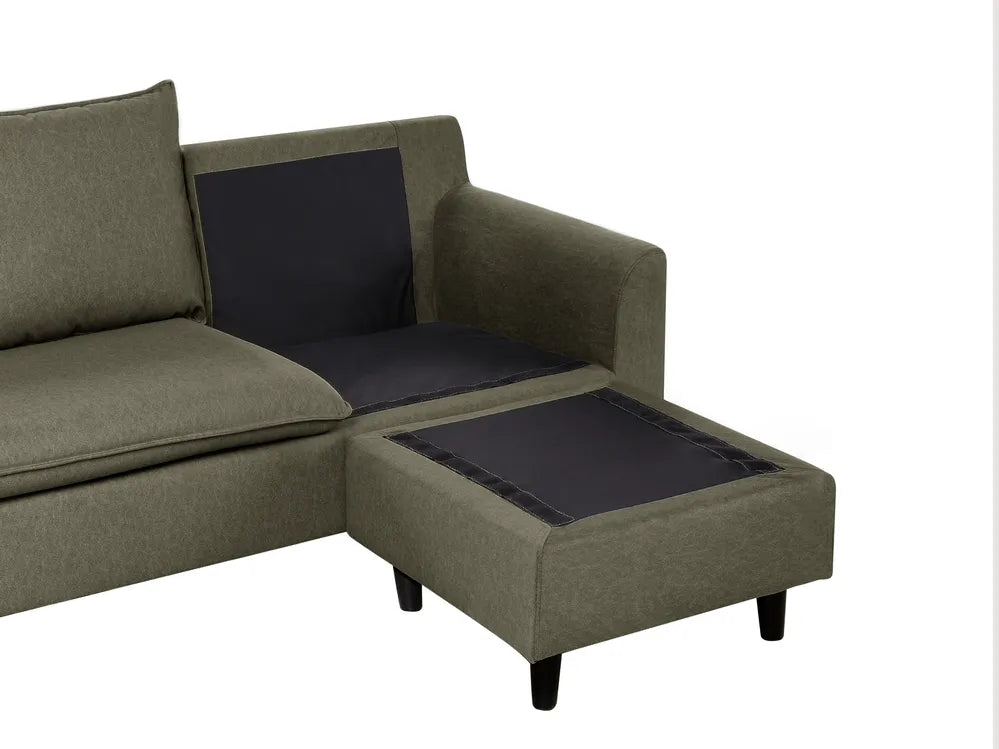 This corner sofa combines a classic style with a modern twist. With the reversible design that allows you to place the ottoman on either side, this sofa creates an ideal conversation area in any living room, complementing both traditional and contemporary decor. The piece features durable upholstery in an elegant colour complemented by slender, rubberwood legs that ensure stability. Due to used material, the sofa is also easy to clean. A thickly padded foam seat and loose back made from three large cushions make this sofa perfect for those who appreciate a high level of comfort.