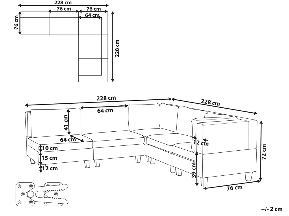 The furniture designed to suit your home, this sofa comes with five modular pieces that can be easily arranged into a corner. The wide and deep seats grouped together create a large, comfortable space, ideal to stretch out your legs and fully relax. The piece is equipped with plastic legs in black. Thanks to the polyester upholstery in a neutral colour the sofa perfectly complements a wide variety of decor styles and colour schemes.