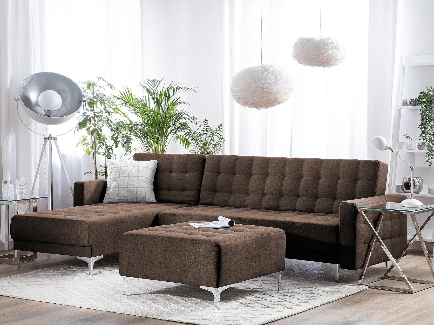 This large corner sofa is an ideal anchor piece for your living room, inviting and homely. Versatile in design, the sofa can be turned into a comfortable bed for two thanks to the adjustable backrest. Additionally, the chaise can be positioned on either side to suit your needs. Fully upholstered in high-quality, brown fabric with elegant tufting, this corner sofa offers both functionality and timeless style that will highlight the best of any modern home. The whole piece is kept stable thanks to metal legs.