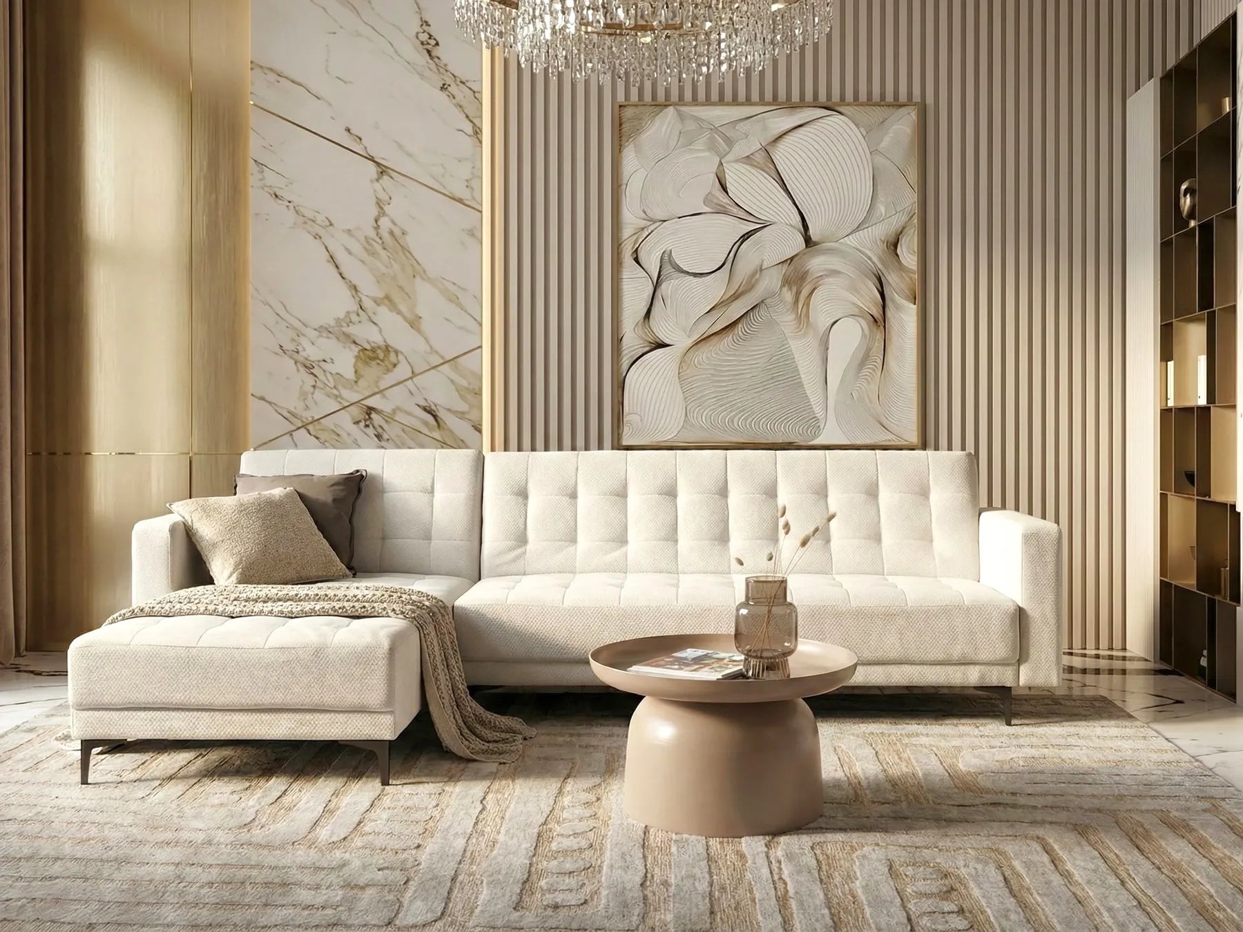 Este sofá de canto é a peça ideal para ancorar a decoração de uma sala e dar um toque convidativo à sua área de repouso. Pode ser facilmente convertido numa confortável cama para dois graças ao encosto ajustável. Além disso, a chaise-longue pode ser posicionada em qualquer um dos lados, de acordo com as suas necessidades. Totalmente estofado em tecido de alta qualidade e elegância este sofá oferece funcionalidade e um estilo intemporal que funciona bem em qualquer ambiente moderno. A peça é muito estável graças às suas pernas em metal preto, que adicionam um toque contemporâneo e um contraste subtil. Modular, pode ser combinada com outras peças da coleção de modo a criar uma disposição de assentos personalizada à sua medida.
