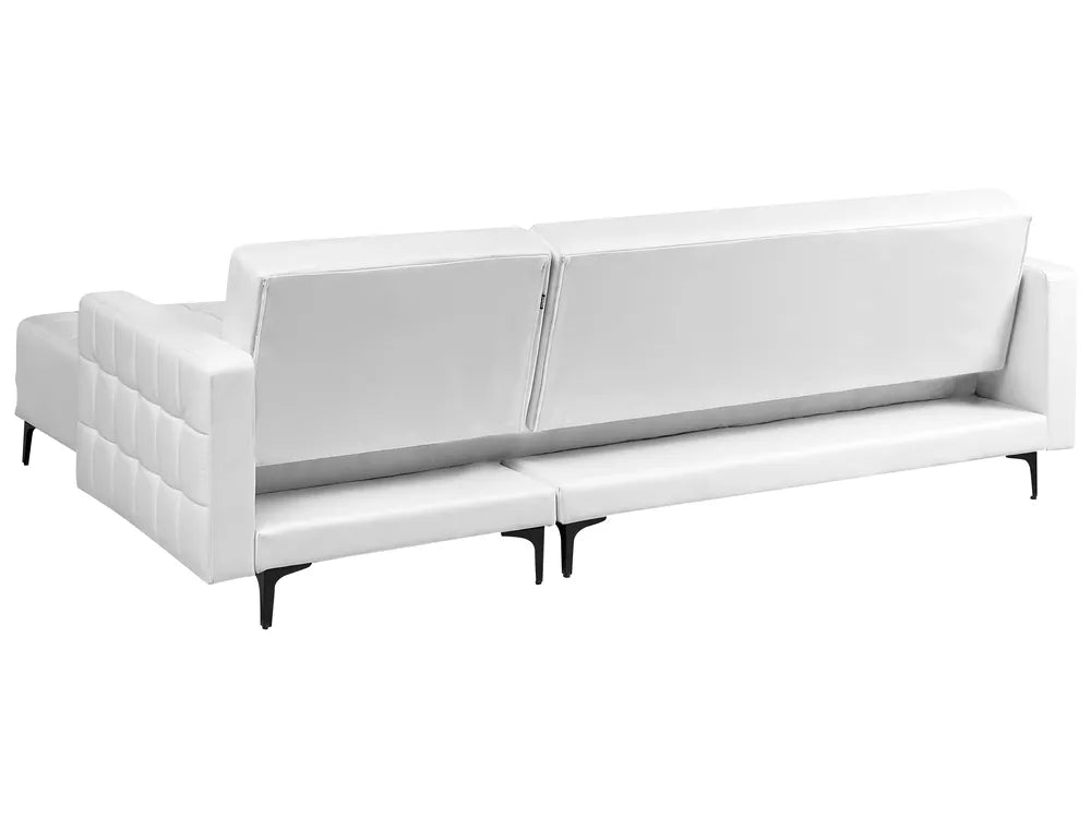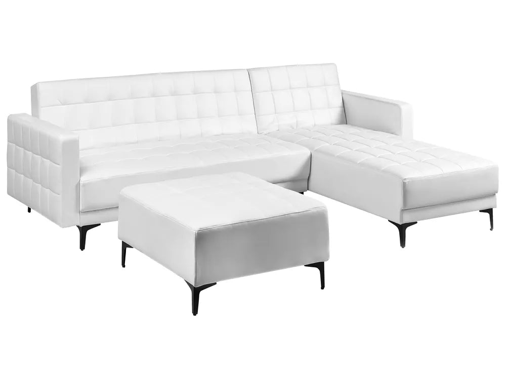 This large corner sofa and ottoman set is an ideal anchor piece for your living room, inviting and homely. Versatile in design, the sofa can be turned into a comfortable bed for two thanks to the adjustable backrest. Additionally, the chaise can be positioned on either side to suit your needs. Fully upholstered in high-quality faux leather and decorated with elegant tufting, it suits any interior colour scheme. The piece is elevated on sleek black metal legs that add a contemporary touch and subtle contrast. Due to its modular design, it can be combined with other elements from the collection to create a seating arrangement tailored to suit you.