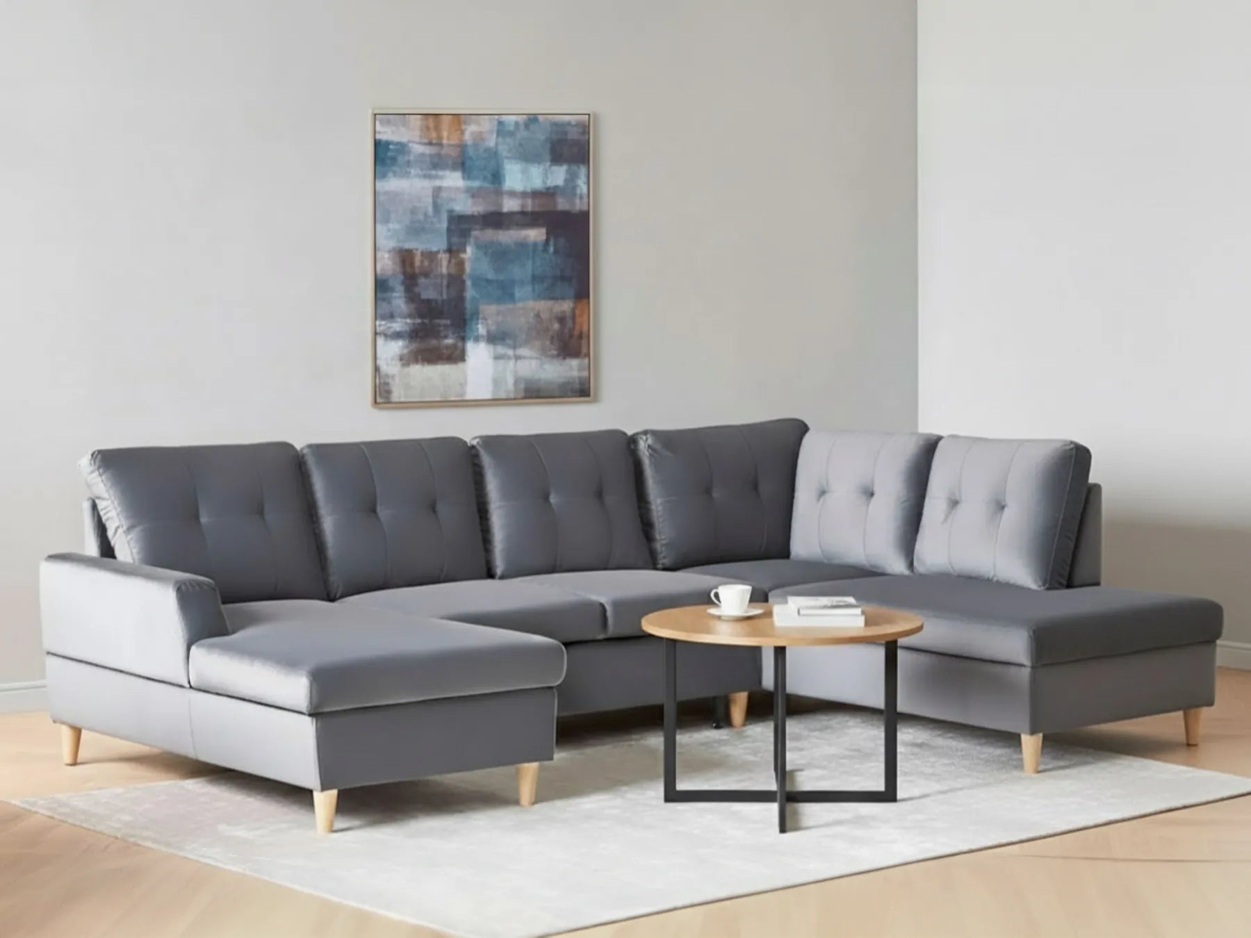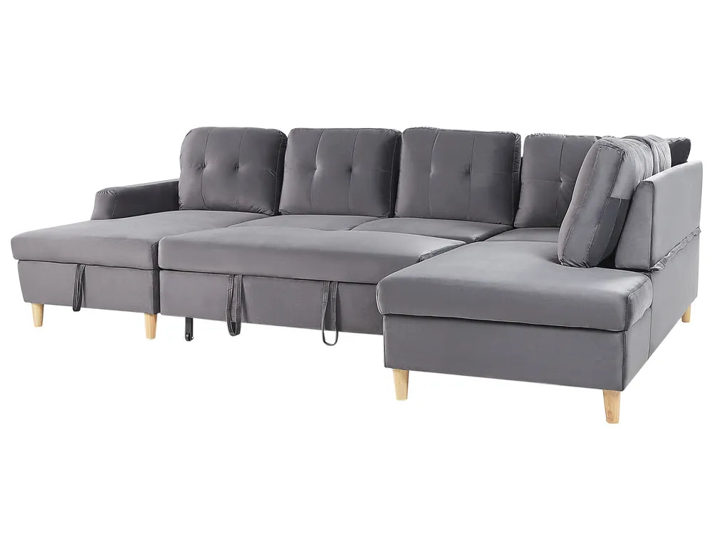 Elevate the design and comfort of your living room with this upholstered corner sofa. The piece is covered with high-quality velvet, which not only makes it pleasant to touch, but also durable and easy care. The couch is placed on a set of solid wooden legs, so it's very stable. The corner features a sleeper function, so you can have your guests overnight; not only that, the product also comes with a storage ottoman, so you'll always have a place to store away extra cushions or sheets. The sofa's pillow backrest draws attention thanks to decorative tufting, which makes the whole construction stand out.