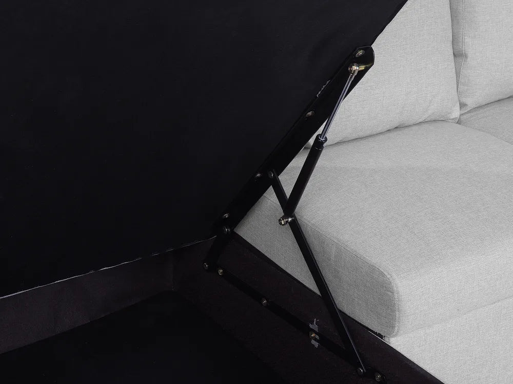 Anchor the design of a large interior with this inviting, versatile sofa bed. This generous, modern, U-shaped sofa allows five people to comfortable lounge. Two chaise lounges boast hidden storage space and the middle piece is designed with a pull-out mechanism to transform the sofa into a bed if needed. Fully upholstered in high-quality polyester fabric in modern light grey and featuring synthetic legs with protective caps, the sofa comes complete with a set of pillows with removable cases.