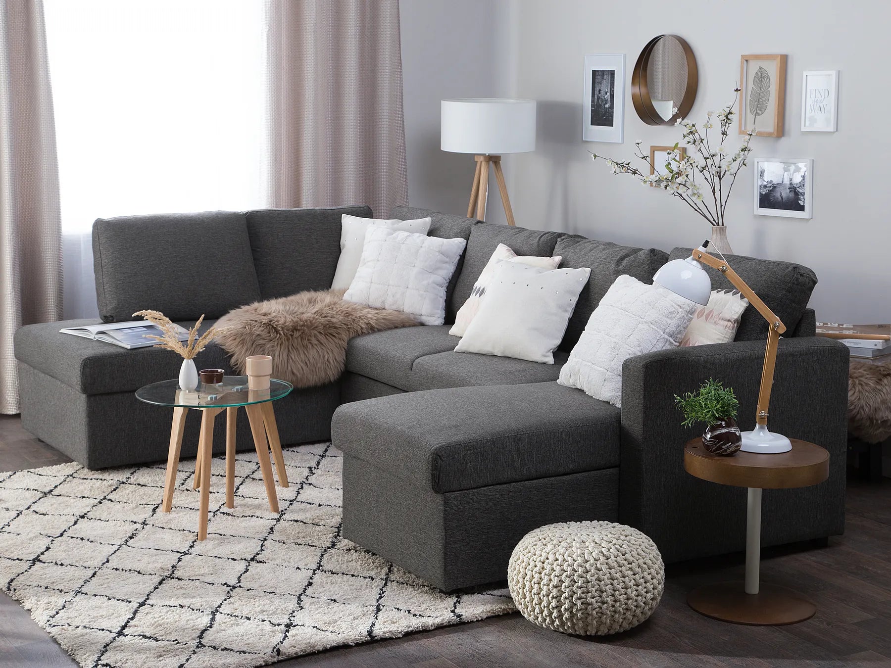 Anchor the design of a large interior with this inviting, versatile sofa bed. This generous, modern, U-shaped sofa allows five people to comfortable lounge. Two chaise lounges boast hidden storage space and the middle piece is designed with a pull-out mechanism to transform the sofa into a bed if needed. Fully upholstered in high-quality polyester fabric in modern dark grey and featuring synthetic legs with protective caps, the sofa comes complete with a set of pillows with removable cases.