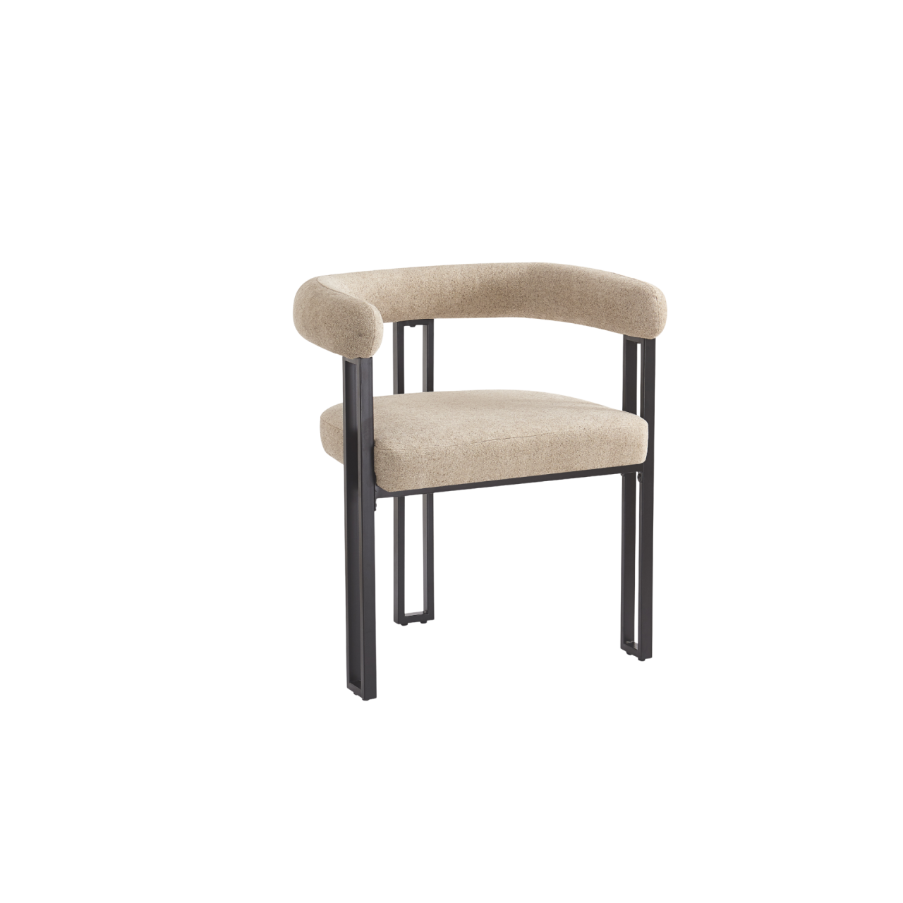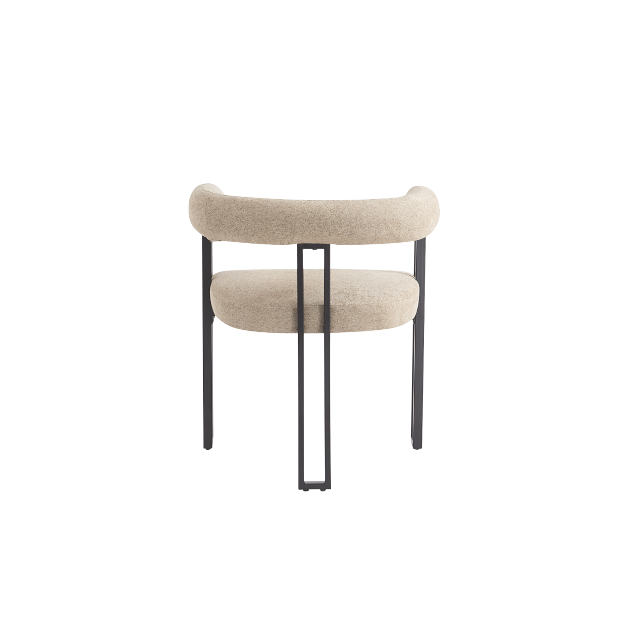 The Bloom Dining Chair strikes a modern and unforgettable silhouette. Three black, powder-coated metal legs connect the design from top to bottom. Each has a rectangular shape, empty in the middle to create a sense of lightness and airiness. The seat combines depth and generous cushioning to provide a comfortable sitting experience, while the horseshoe-shaped backrest curves towards the front of the chair, enveloping the seat. The chair's compact shape means that it can be easily tucked away under most tables to save space if needed.