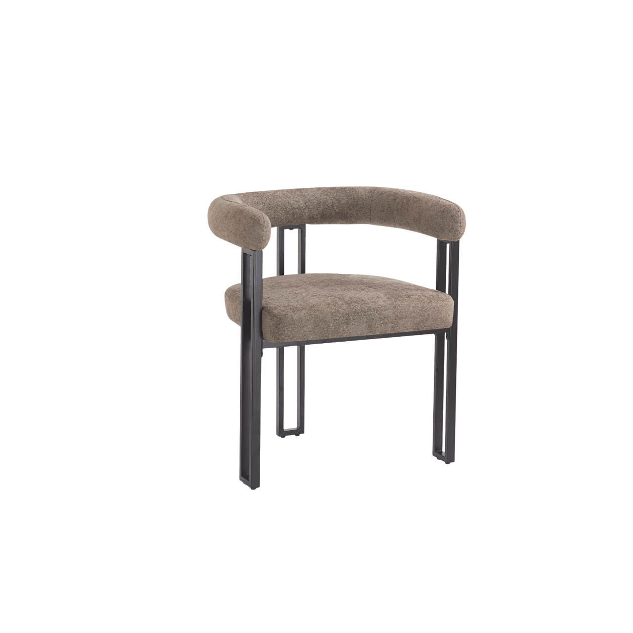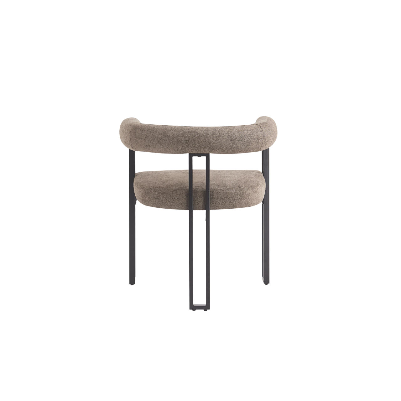 The Bloom Dining Chair strikes a modern and unforgettable silhouette. Three black, powder-coated metal legs connect the design from top to bottom. Each has a rectangular shape, empty in the middle to create a sense of lightness and airiness. The seat combines depth and generous cushioning to provide a comfortable sitting experience, while the horseshoe-shaped backrest curves towards the front of the chair, enveloping the seat. The chair's compact shape means that it can be easily tucked away under most tables to save space if needed.
