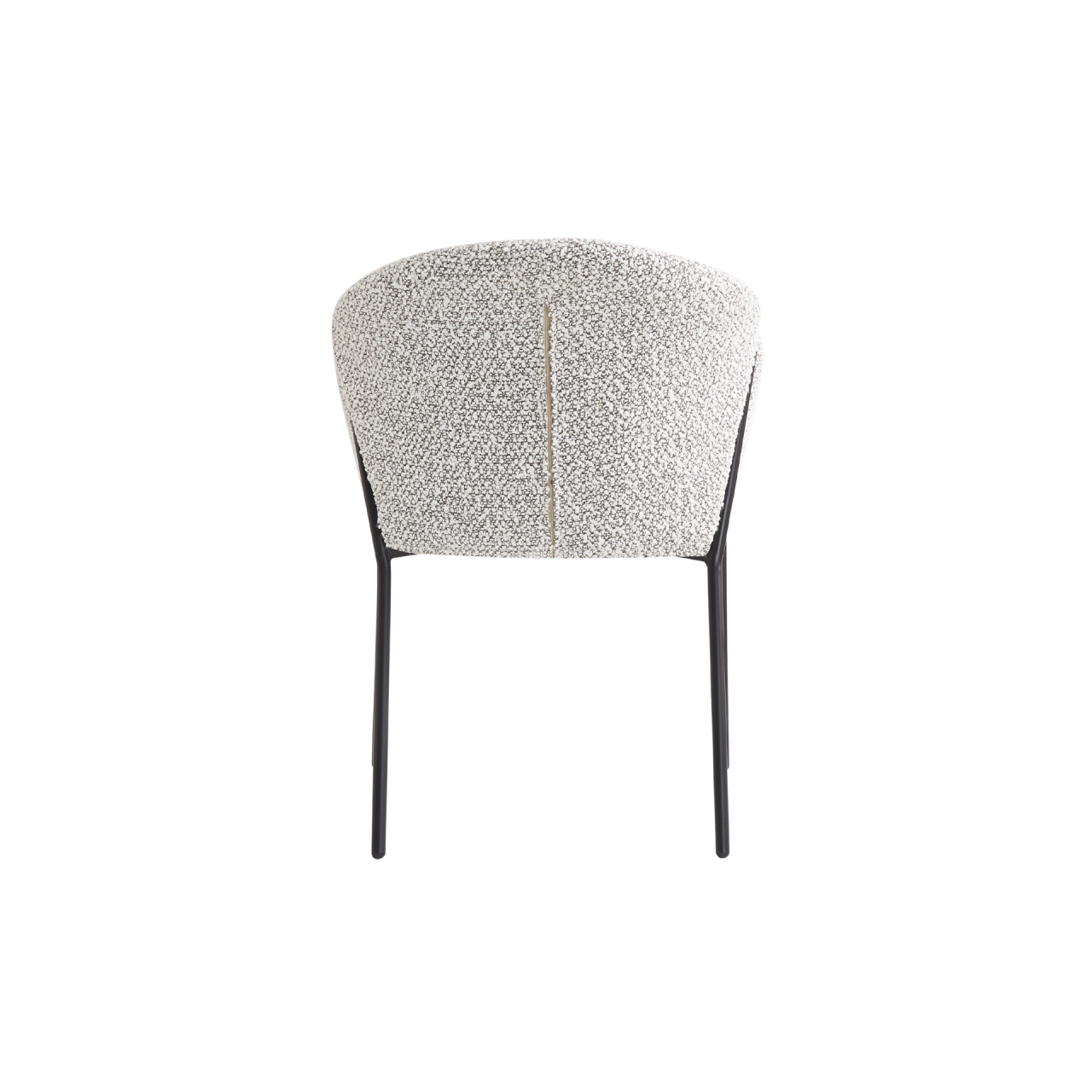 The Petal Dining Chair combines everyday functionality with a stunning design reminiscent of a blossoming flower. Its frame is made up of black, powder-coated metal, crossing under the seat and soldered to the legs which partially extend beyond the seat in the front and at the back. The chair is upholstered in flame-retardant fabric, creating a soft contrast with the metal legs. Ample cushioning adds extra comfort, while the backrest and armrests gently curve outwards and away from the seat, forming an inviting profile without sharp edges. Overall, the Petal Dining Chair is a versatile choice for contemporary dining spaces.