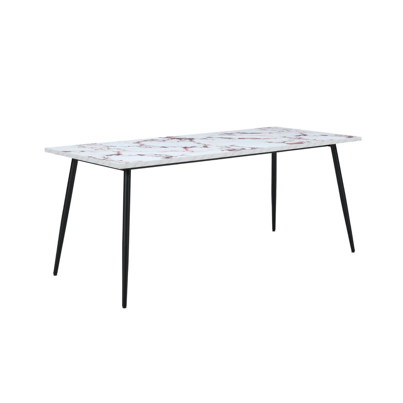 The Horizon Medium Marble-Effect Dining Table is a sleek and stylish choice for modern dining spaces. Its elegant marble-effect finish, featuring subtle hints of yellow and grey, adds a touch of sophistication to any space. The matt black powder-coated metal legs taper outward, complementing the refined tabletop for a striking, contemporary look. Crafted from high-quality, responsibly sourced materials, it provides a durable, sustainable solution for compact dining areas.
