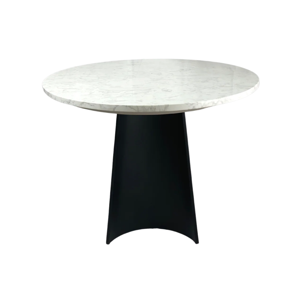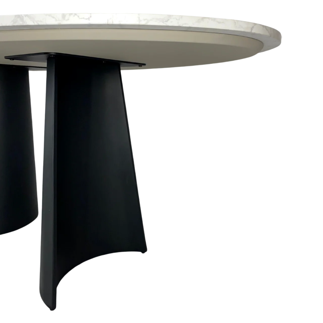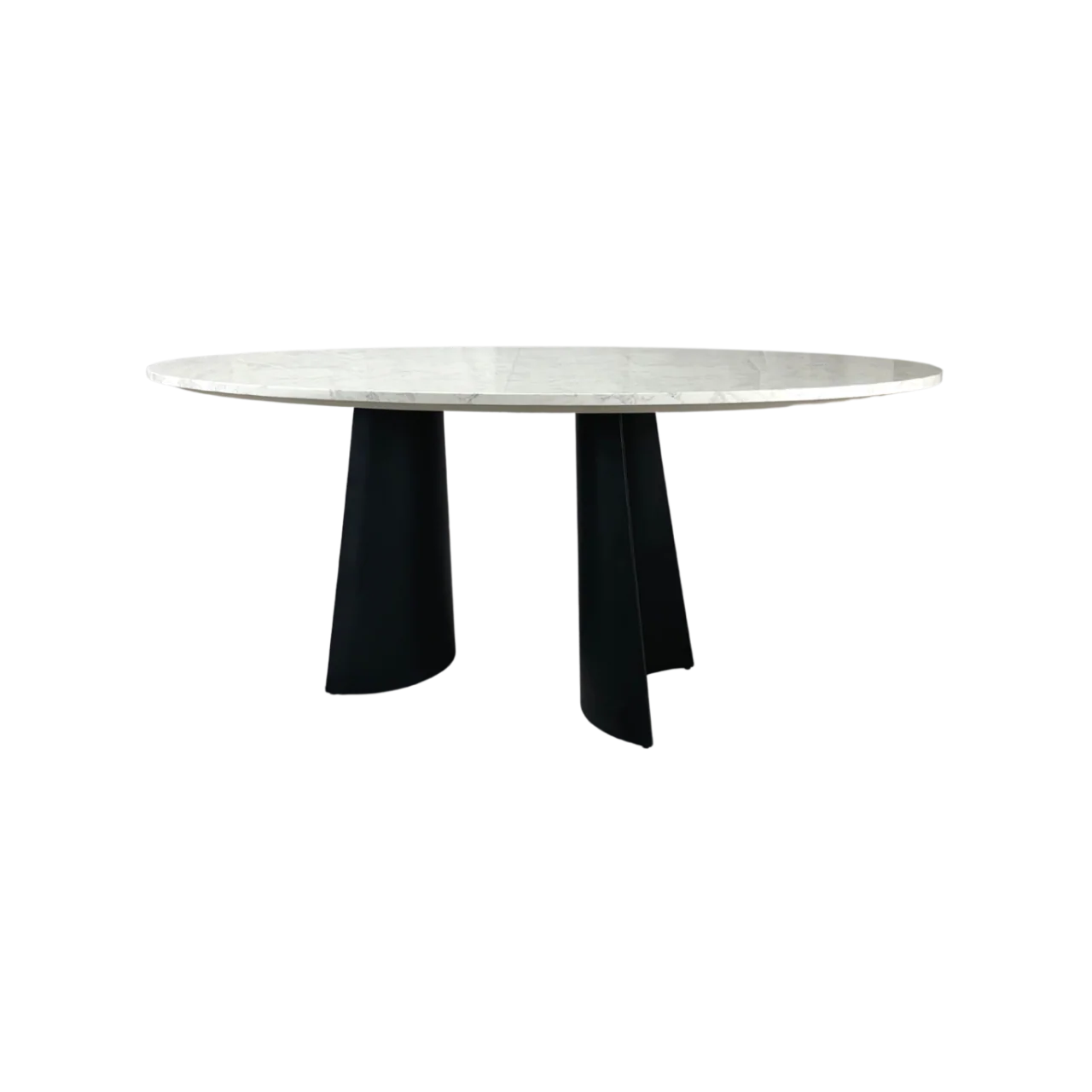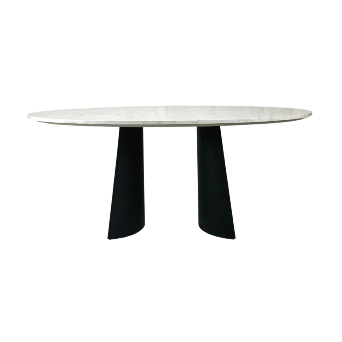 With its oval shape and post-modern design, the Rosemary Oval Dining Table strikes an imposing silhouette. It is the quintessential focal point of any contemporary dining space. Its top is made from artificial marble, which is perfect for dining rooms because it is stain-resistant and easy to clean. The shape and size of the top offer a large amount of space, enough to fit 6 chairs. The black powder-coated metal legs of the table are spaced apart from each other to keep it balanced. They are crescent-shaped and hollow. They have small protector pads at the bottom to stop them from scratching the surface of the floor, as the table is quite large and hefty. The legs are screwed on an MDF board which is attached to the top. They contrast nicely with the marble colouration of the top, creating a sophisticated look that is ideal for luxurious, minimalist interiors.