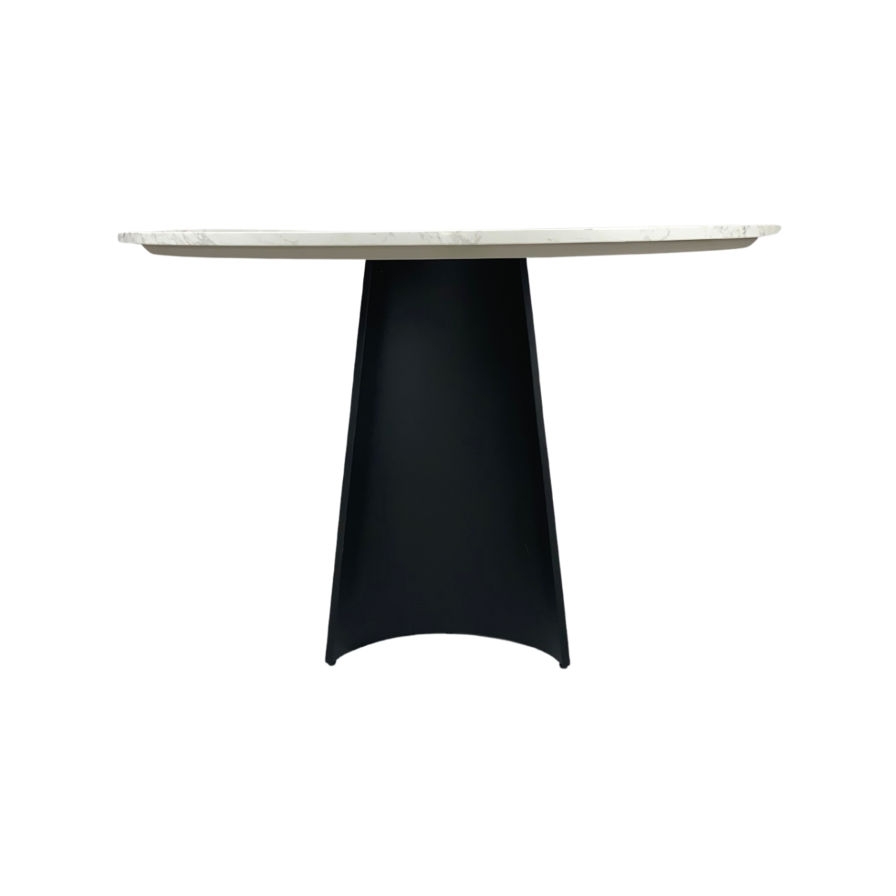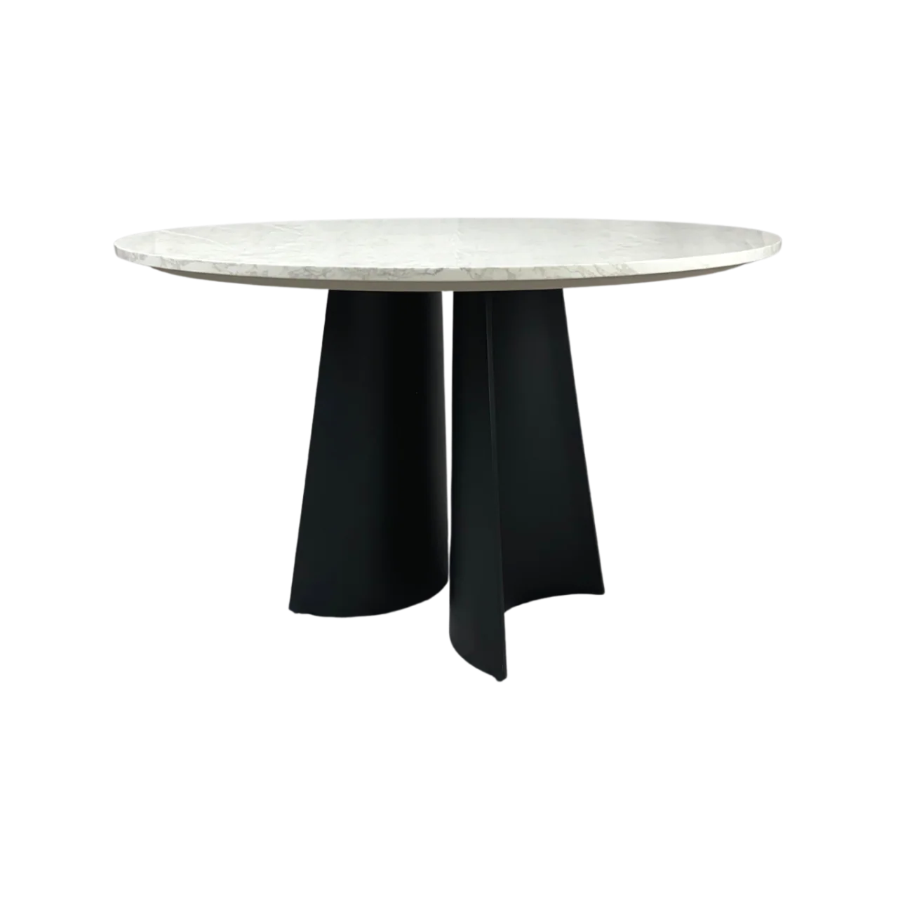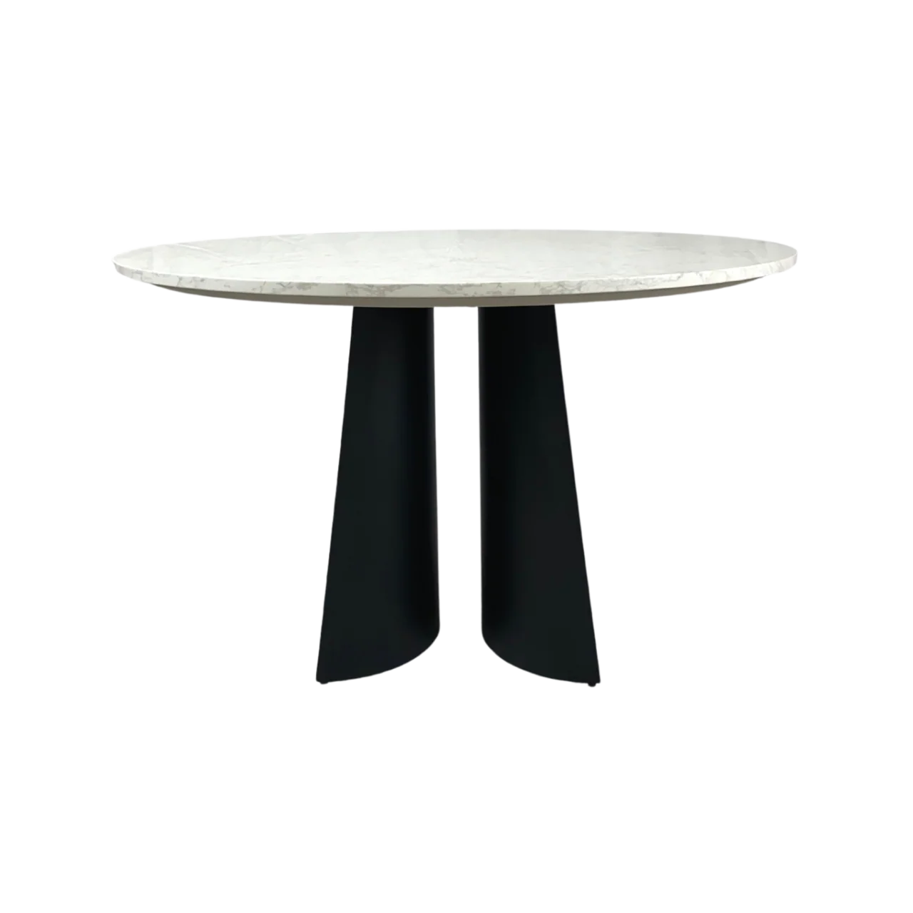 The Rosemary Round Dining Table is a stylish post-modern piece of furniture that would be the ideal fit for any modern, minimalist dining room. It has a spacious round top, made from artificial marble. This material is ideal for kitchen settings because it is easy to clean and does not stain like regular marble. The top sits on an MDF board attached to two semi-conical legs made from black, powder-coated metal. They are thick and hollow, so as not to weigh too much. The legs have small protector pads at the bottom to protect the floor from being scratched by them. Their dark colour contrasts with the white marble top, giving the Rosemary table an engaging, neutral look.