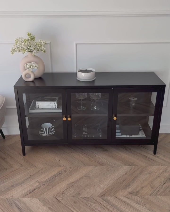 This elegant sideboard is a great storage solution for any hallway, living room, and home office. Sturdy steel construction makes the piece stable and long-lasting. Capacious compartments behind tempered glass doors provide ample storage space, perfect for books, dishes, and decorative elements.