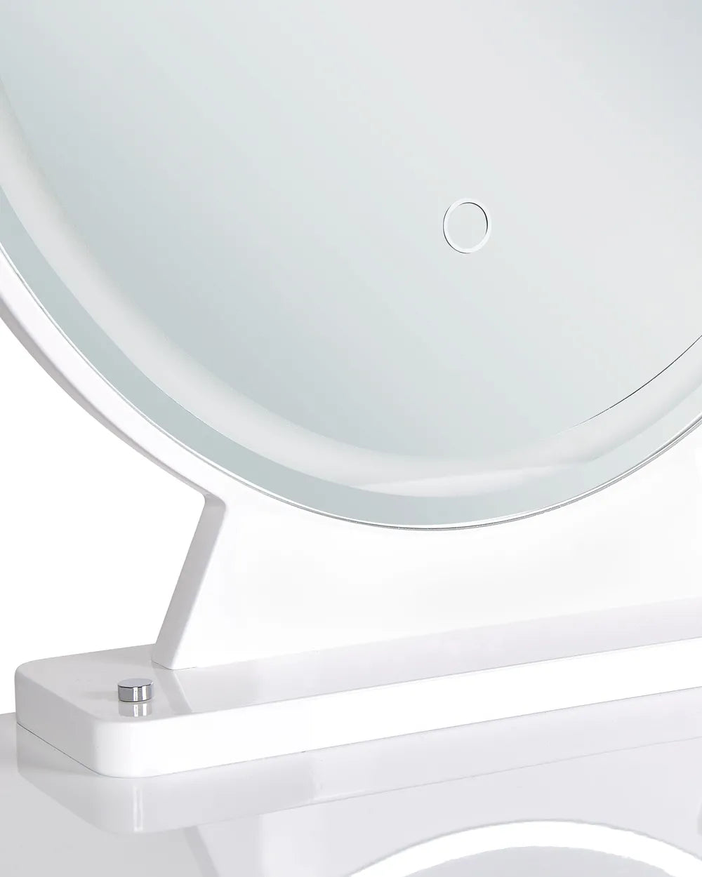Feel comfortable creating your everyday make-up with this ultra-stylish dressing table. Its decorative metal legs in gold colour contrast wonderfully with the classic top in a universal, white shade and its high gloss finish. The seat of the stool with a matching design is covered with a durable and easy-to-clean fabric. Two capacious drawers will allow you to have all the necessary cosmetics and trinkets at hand, and the built-in organizer for one of them will help you also to sort your jewellery. The oval mirror attached to the top has inbuilt LEDs that shine in three available modes, which will certainly facilitate your daily routine.