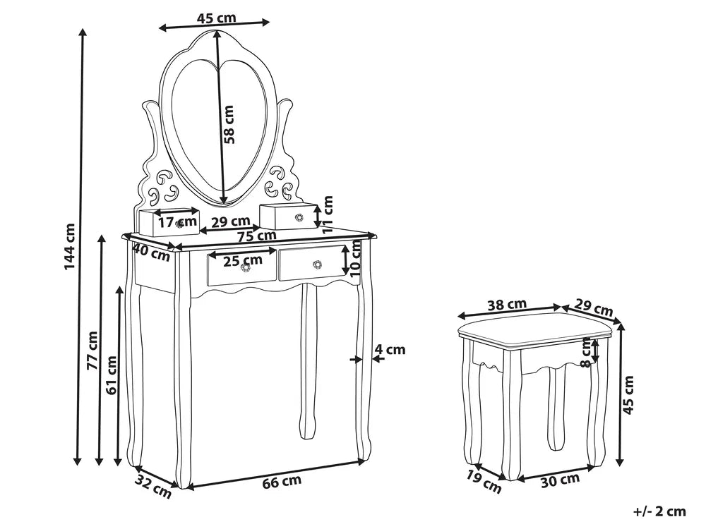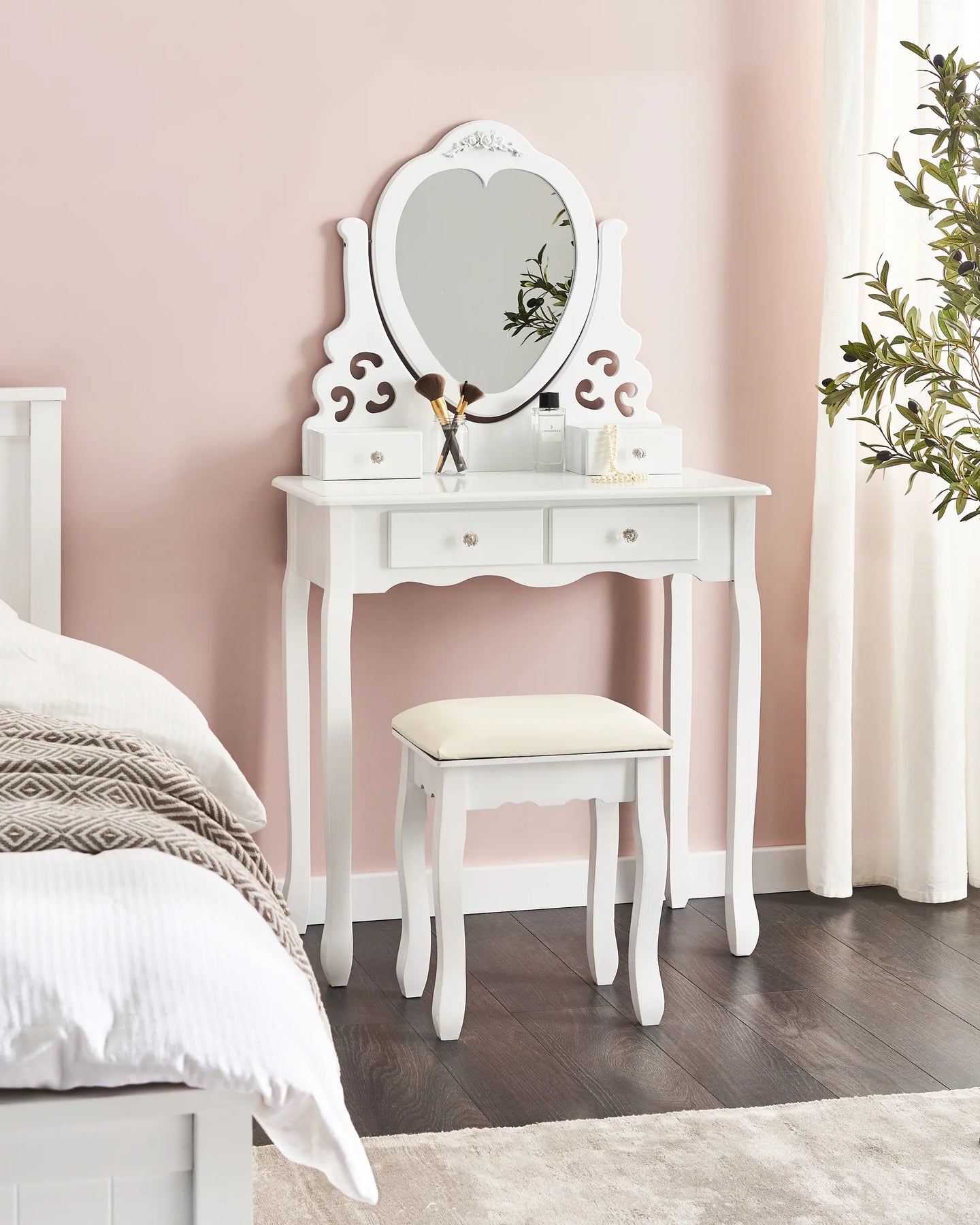 Add a glamorous touch to your interior with this charming dressing table. Its ornamental shape and crystal-like handles are true eye-catchers that will certainly adorn any bedroom or living room. The heart-shaped mirror is adjustable vertically, so you can set it at different angles to make your routine even easier. The piece comes with solid wood legs, 4 convenient drawers, where you can organise all the beauty products and a comfortable stool.
