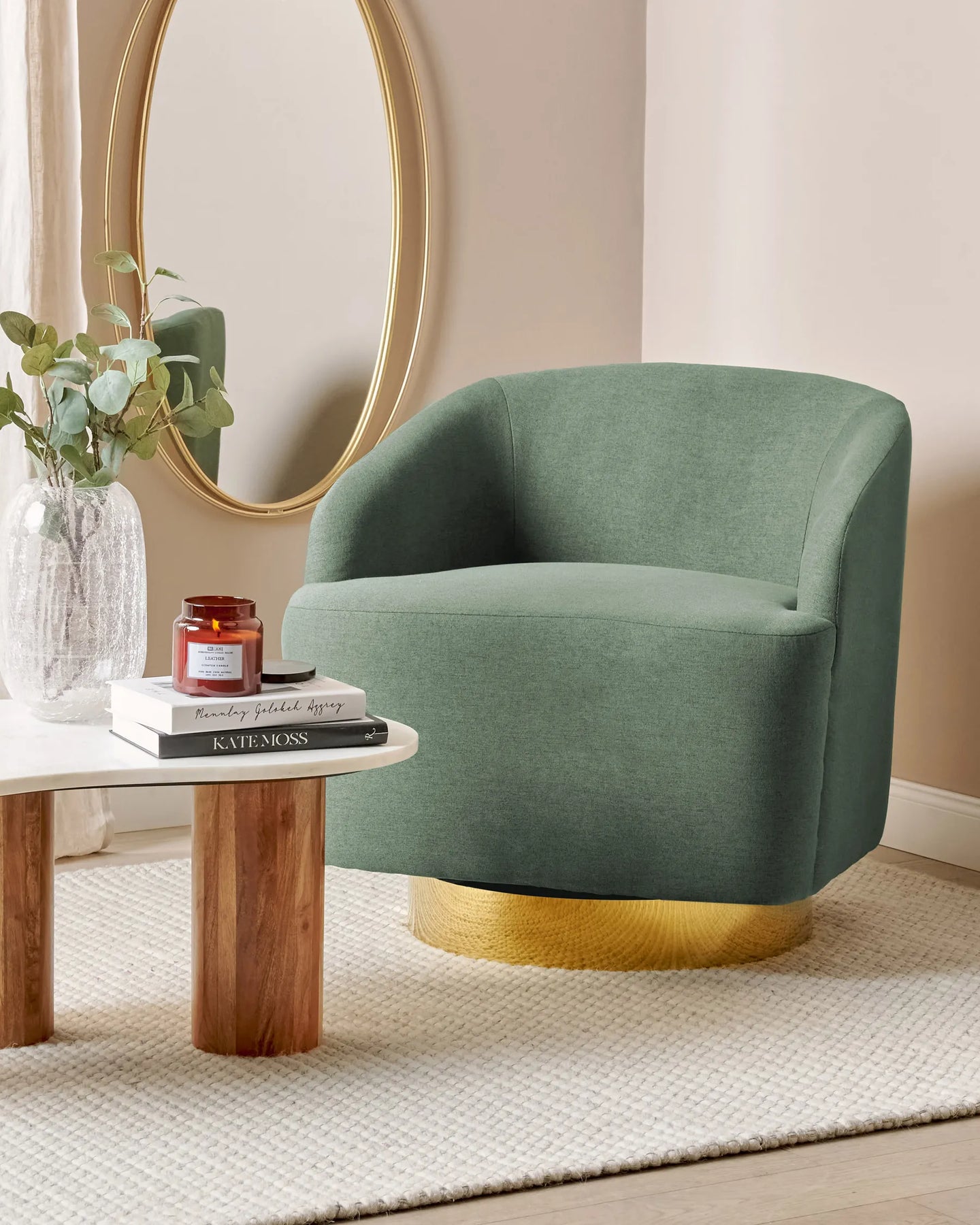 This stylish, retro armchair is definitely going to turn heads in your living room, and will quickly become your favourite lounging spot. It's upholstered with soft-touch, high quality fabric in green tone. The piece also features a golden base, which acts as a swivel - thanks to that, you don't have to move the armchair around if you want to change your sitting arrangement.