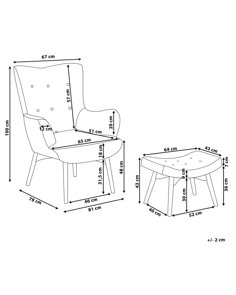 This exceptionally comfortable set comprising of an armchair and an ottoman in a stylish design is set to become an excellent addition to your living room, matching any contemporary or traditional decor. The high-quality fabric is extra sturdy, retaining its look even after prolonged usage. The wide upholstered seat with button decoration and high back and armrests ensure complete seating comfort. The ottoman works best as a footrest, enhancing seating comfort even further. Angled rubberwood legs give the set great stability and longevity.