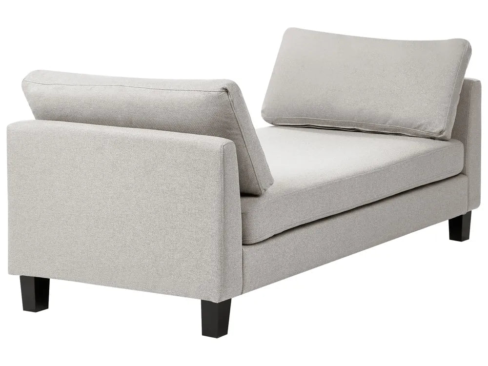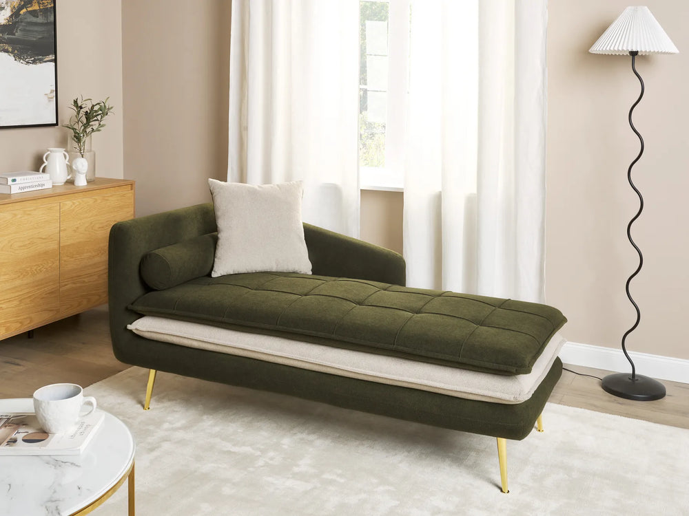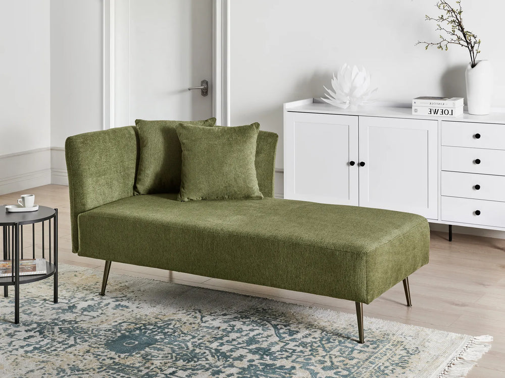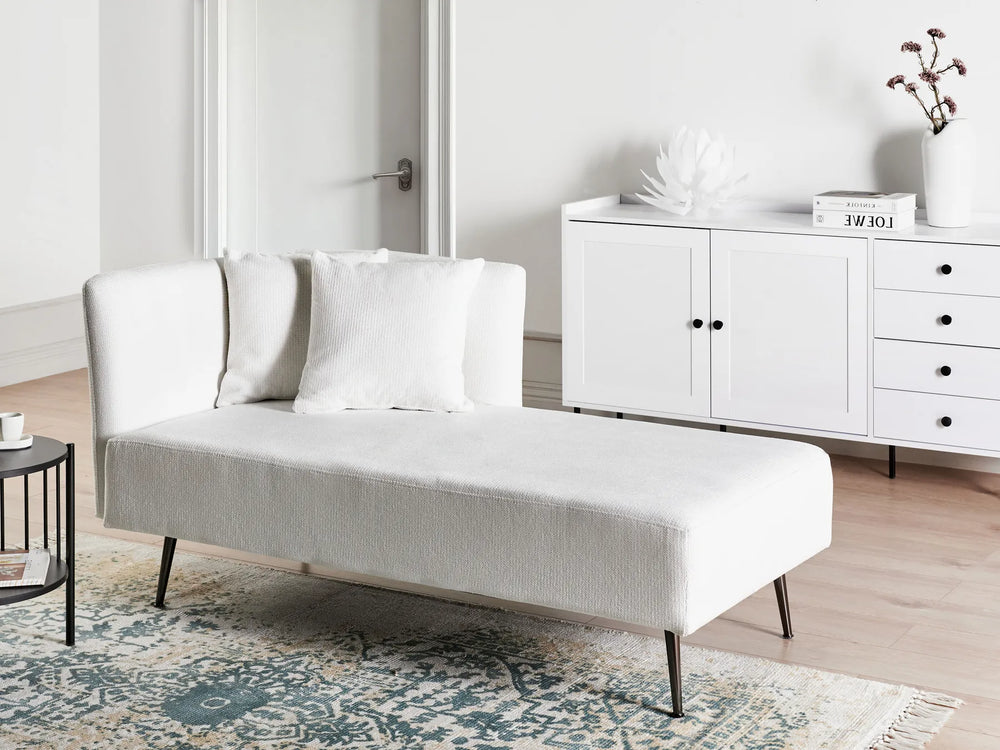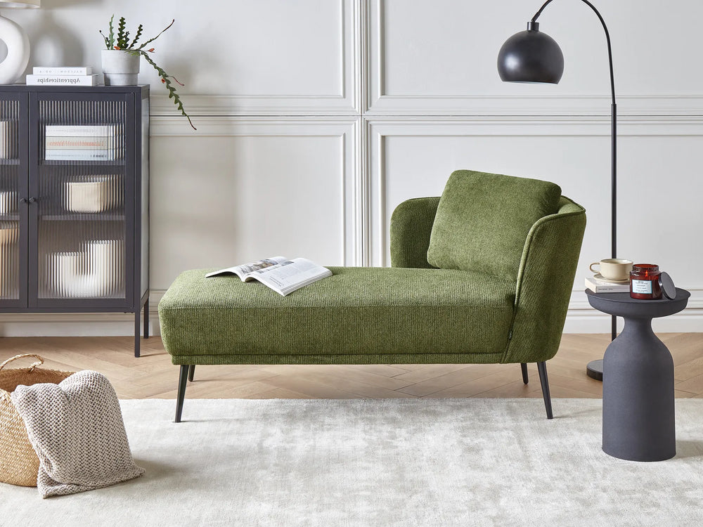 Neutral tones like beige, cream and grey keep the look timeless and easy to style, while deeper shades add contrast and can create a stronger statement. Textured fabric adds depth and helps the chaise feel more premium, especially when paired with warm lighting, soft rugs and layered cushions.