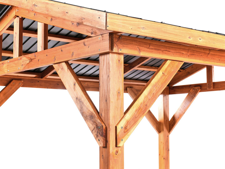 For safety reasons, the pavilion must be secured to the ground. The set includes metal pegs to secure the piece on the lawn, but the fixing hardware for other surfaces is not included., Please note that assembling the tin roof may require the use of a power drill to adjust the holes for a proper fit., Please note that wood is a natural product, therefore each piece may slightly vary. Differences in colour or texture, such as wrinkles or other natural features are not considered a defect and should not be a reason for complaint.