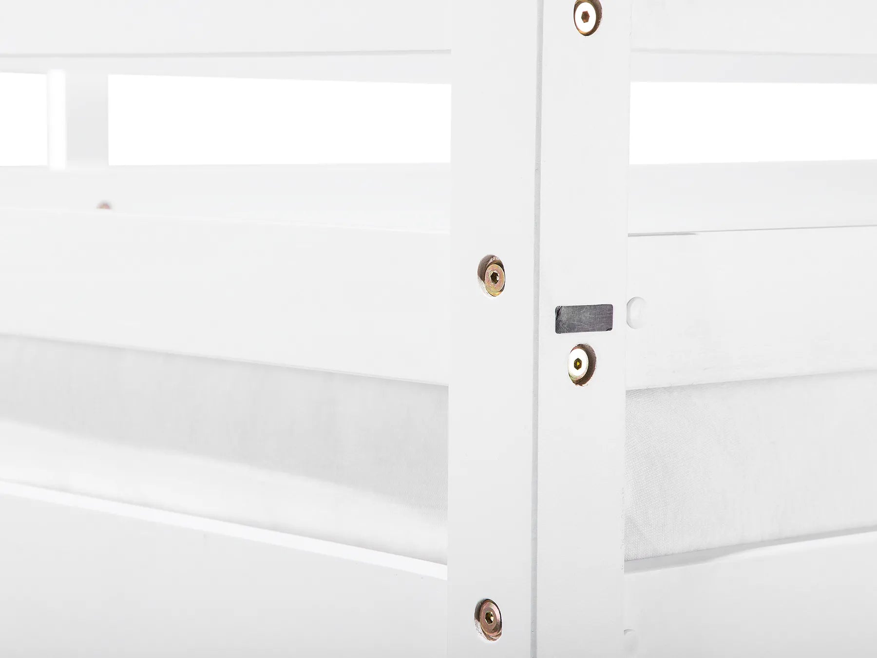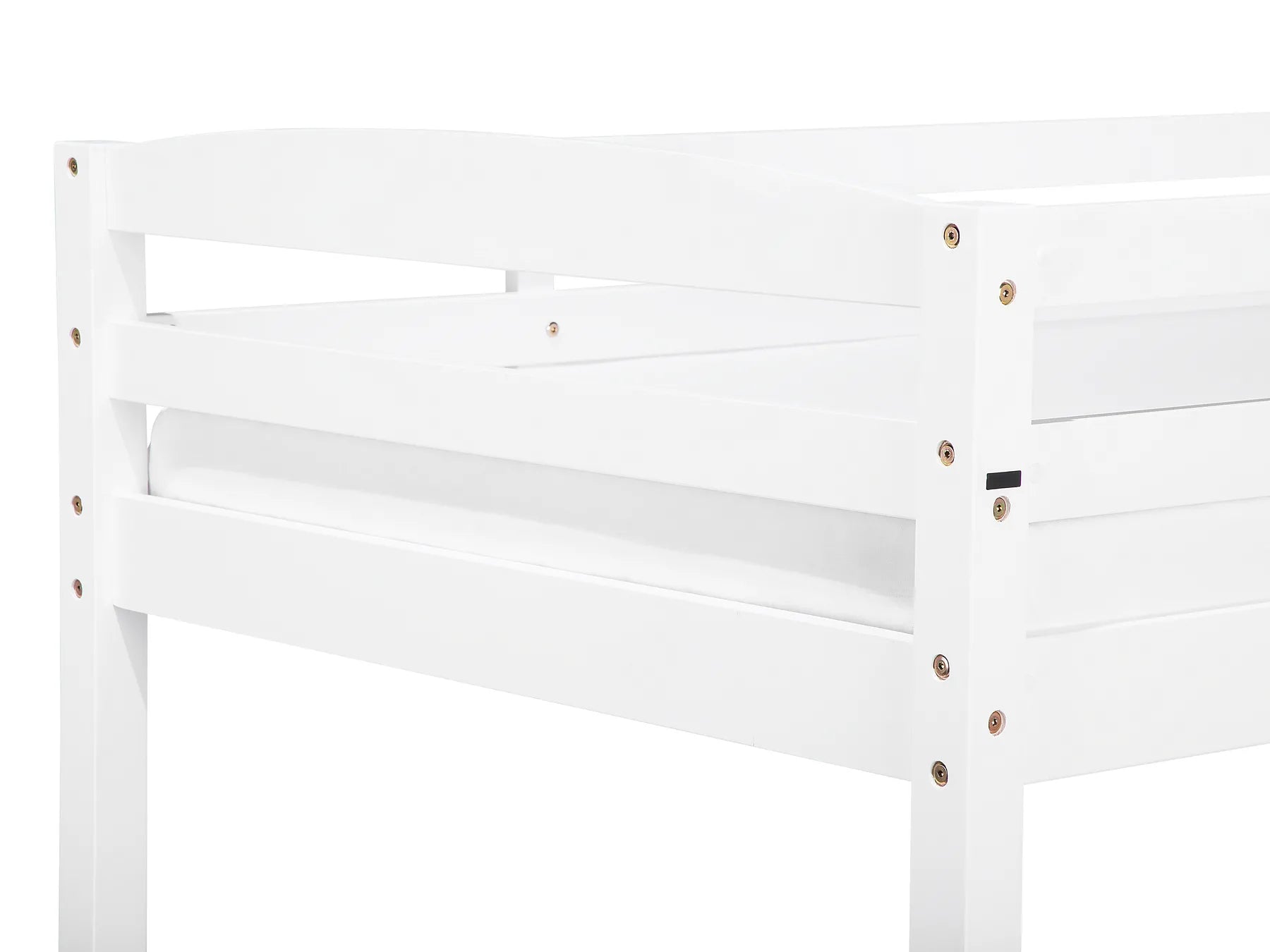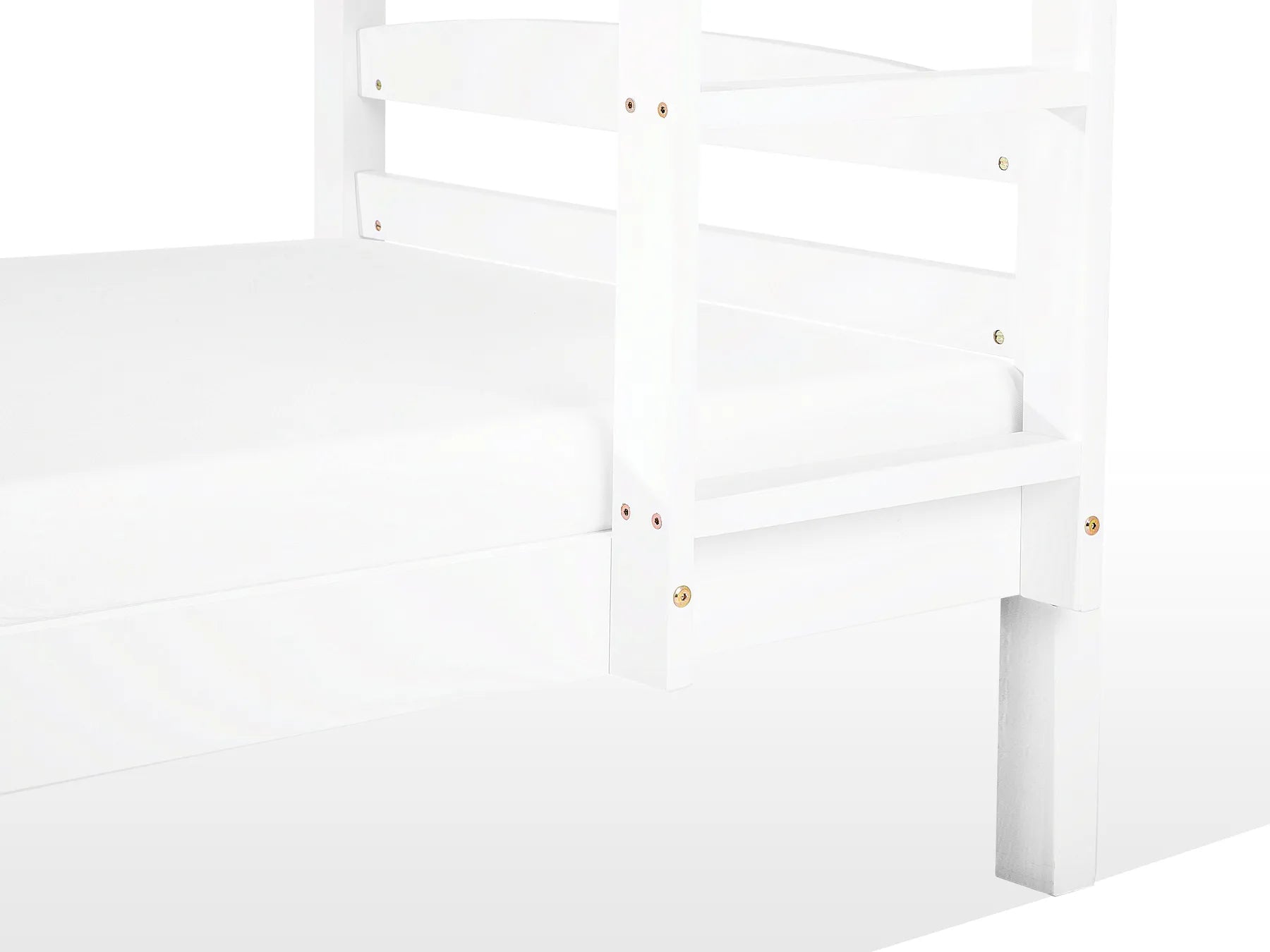 Ultra-functional bunk bed, fun and comfortable sleeping place for children’s or youth room. Made of robust pine wood construction with narrow slatted rails ensures maximum safety while the ladder is easy to climb. With its classic design frame painted in white, the bed blends well with any modern, minimalistic or coastal interior style. The recommended height for the top bunk mattress is less than 13 cm so that rails ensure maximum safety.