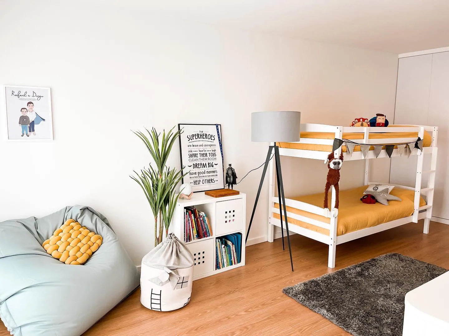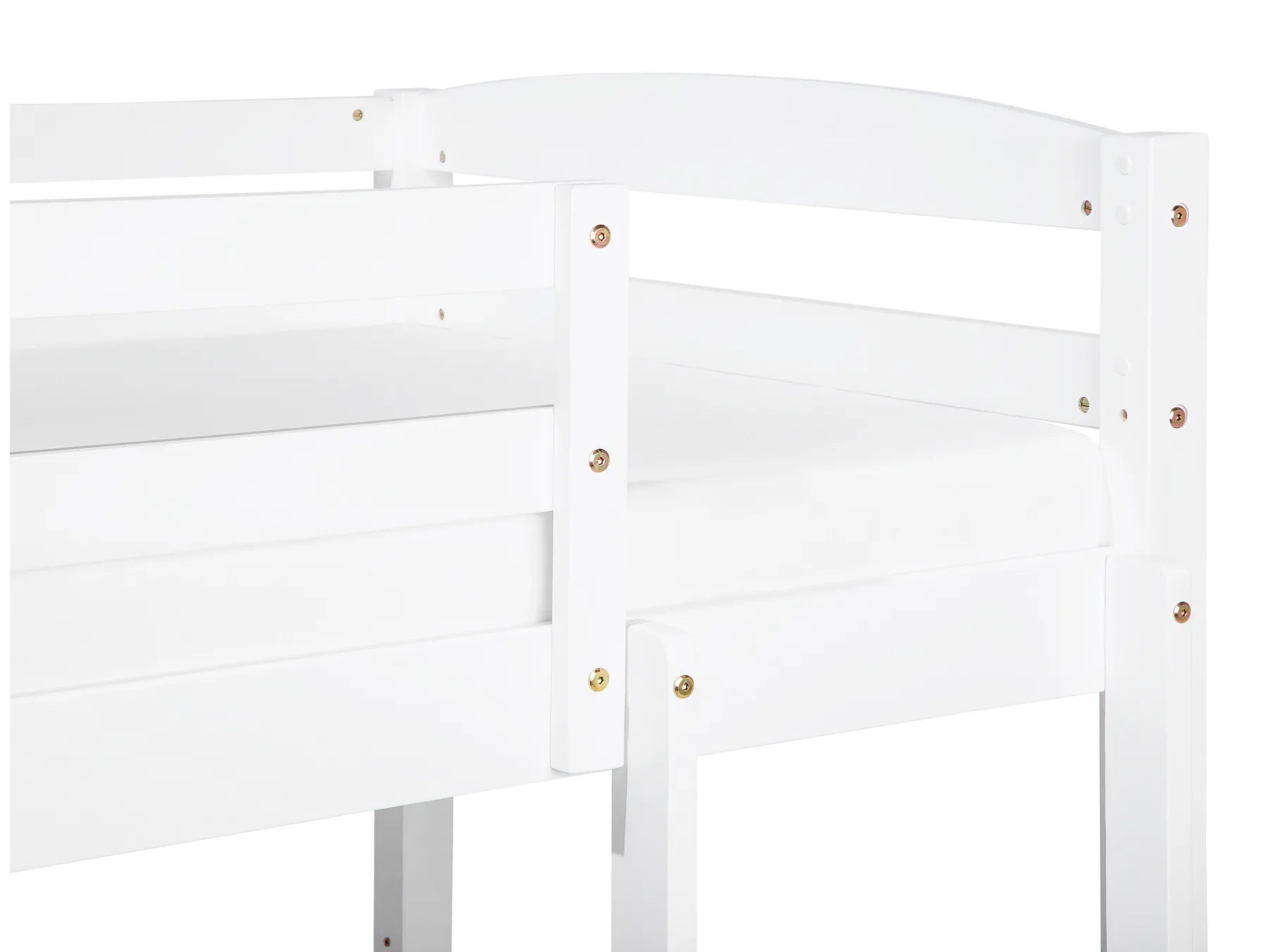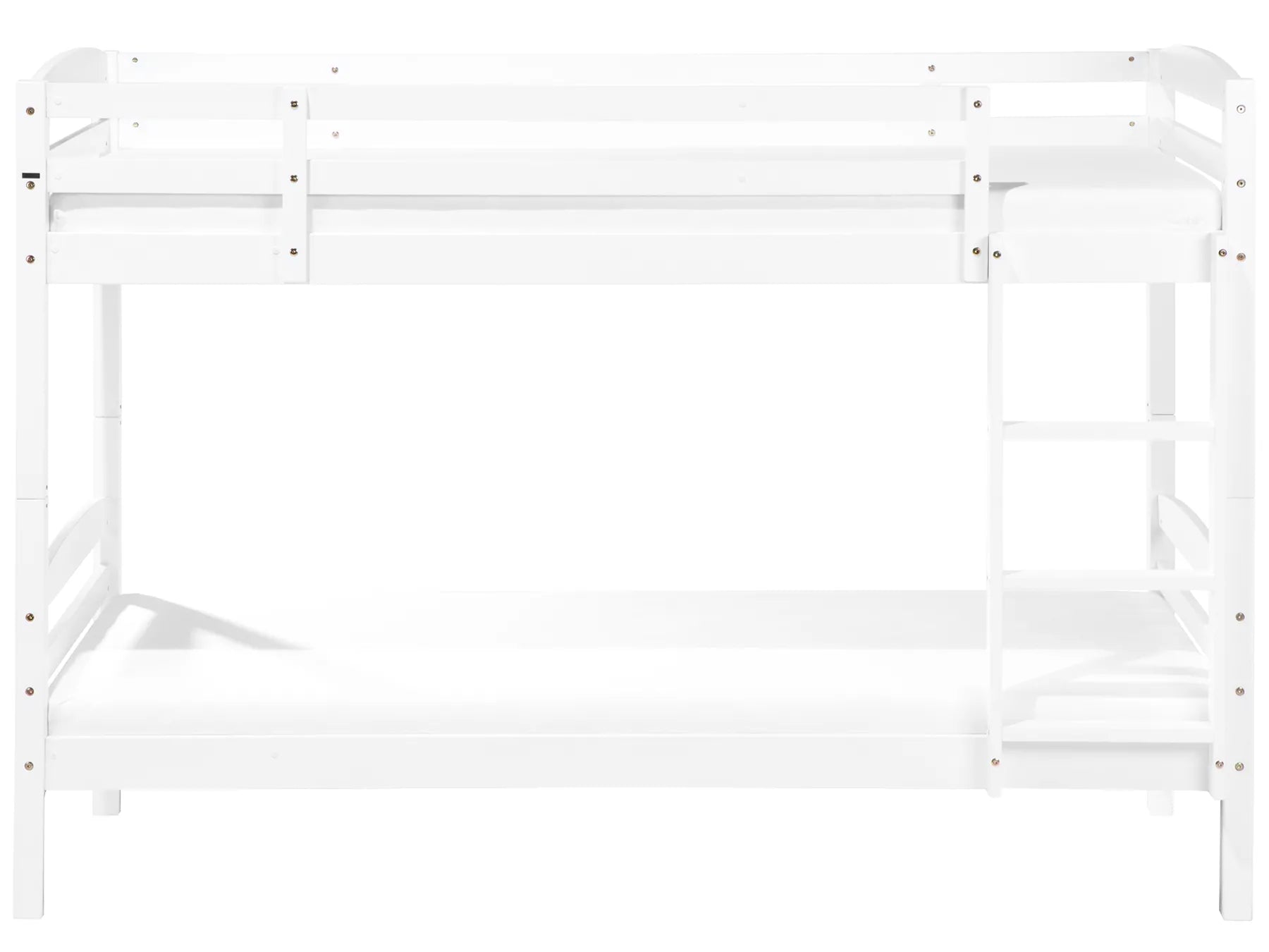 Ultra-functional bunk bed, fun and comfortable sleeping place for children’s or youth room. Made of robust pine wood construction with narrow slatted rails ensures maximum safety while the ladder is easy to climb. With its classic design frame painted in white, the bed blends well with any modern, minimalistic or coastal interior style. The recommended height for the top bunk mattress is less than 13 cm so that rails ensure maximum safety.
