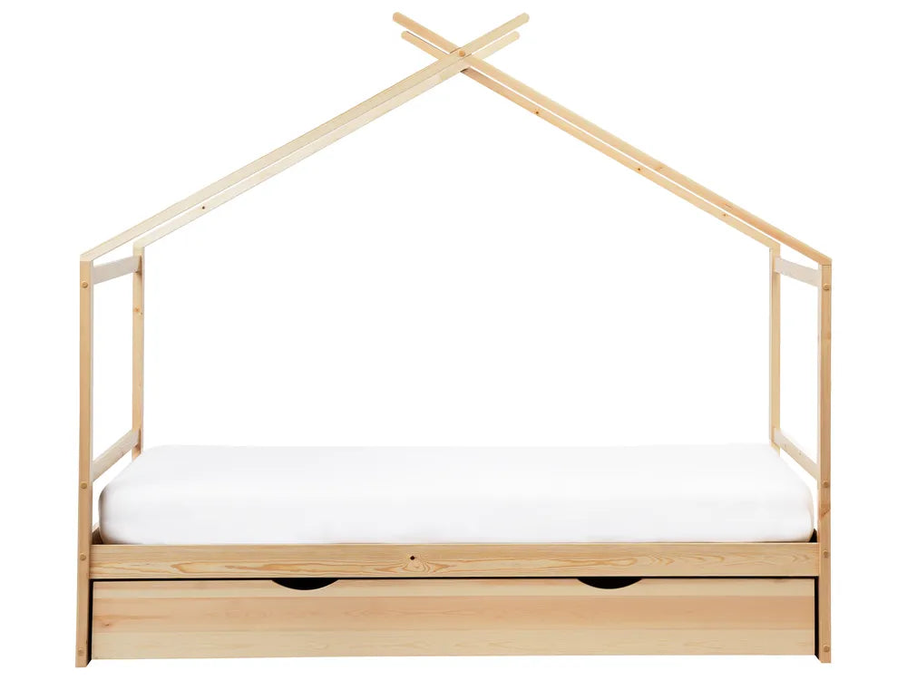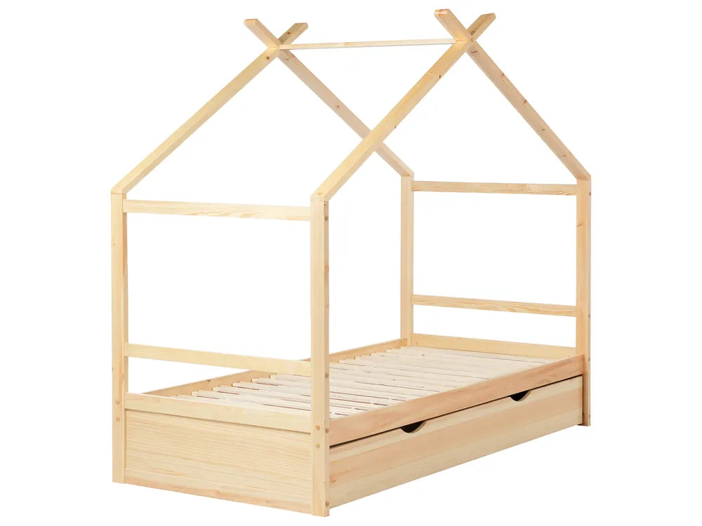 Create a delightful retreat for your child with this enchanting bed. Its stable house-shaped pine wood frame is sure to awaken their imagination, making bed time a pure pleasure. The bedframe includes a slatted bed base suitable for a single-size mattress and features a capacious storage drawer for additional bedding.