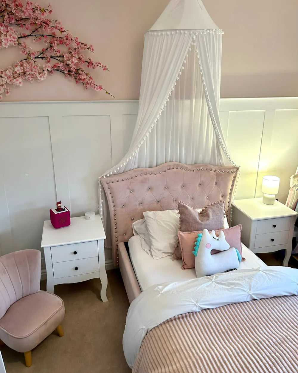 Allow your child to sleep like royalty in this charming bed. It is designed with a glam style and effortlessly transforms any space into a sophisticated haven. Upholstered in high-quality velvet, it is elegant, durable, and easy to maintain. The button tufting, adorned with faux crystals, adds a sparkling allure, while the nail head trim enhances its glamorous appeal. The robust frame provides the mattress support and stability, ensuring a comfortable sleep. Additional storage space is provided with a capacious compartment, which will help you to keep your bedroom neat and well-organized.