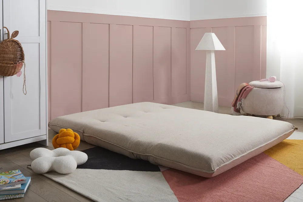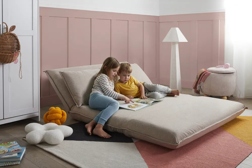 This 2 seater sofa bed is designed especially for children, providing a comfortable and practical seating option for bedrooms or playrooms. Upholstered in a soft, linen-like fabric, it offers a cosy feel with a clean, modern appearance. The cushioned back ensures supportive comfort for relaxing or reading. It easily converts into a bed, making it ideal for naps and sleepovers. What is more, easy clean fabric allows for simple, everyday maintenance.