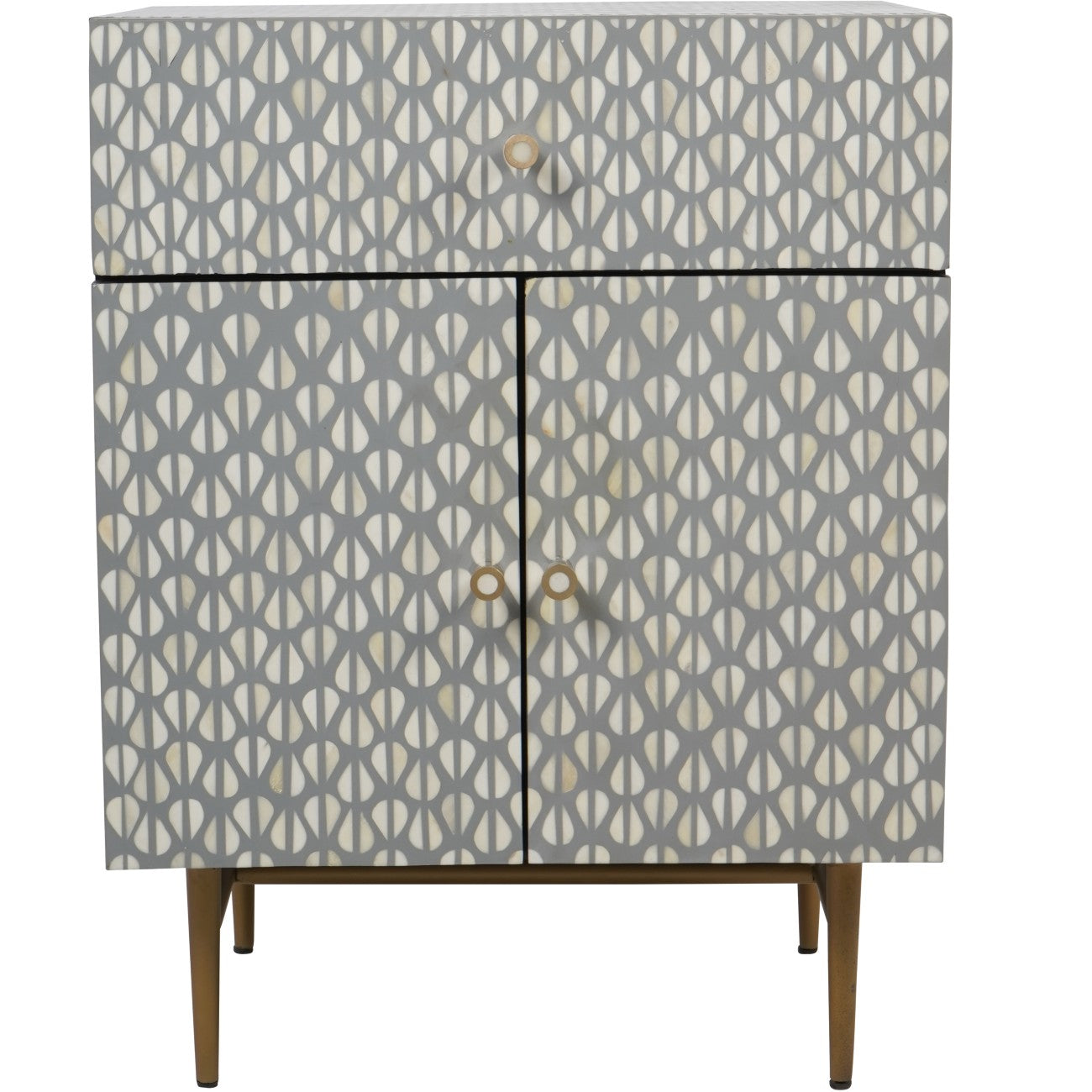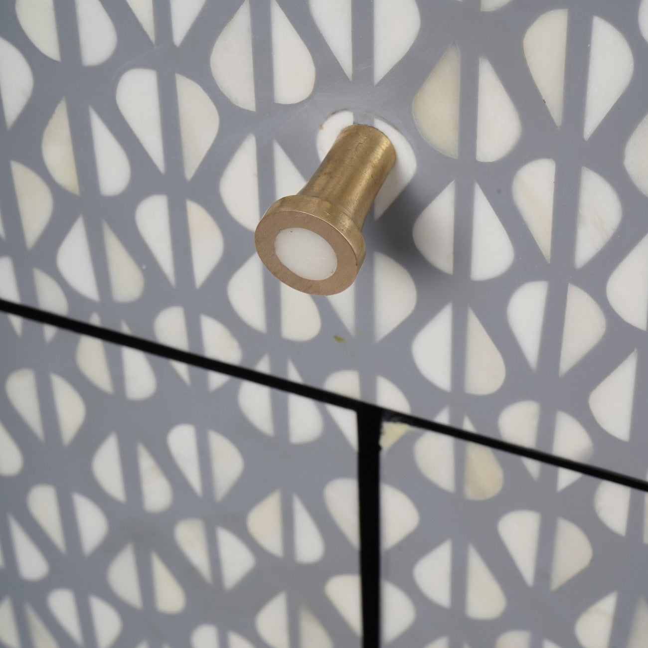 The Burgess Bone Inlay Two Door Bedside Table with Grey & White Pattern is a beautifully balanced piece, designed to make a statement without overwhelming the space.