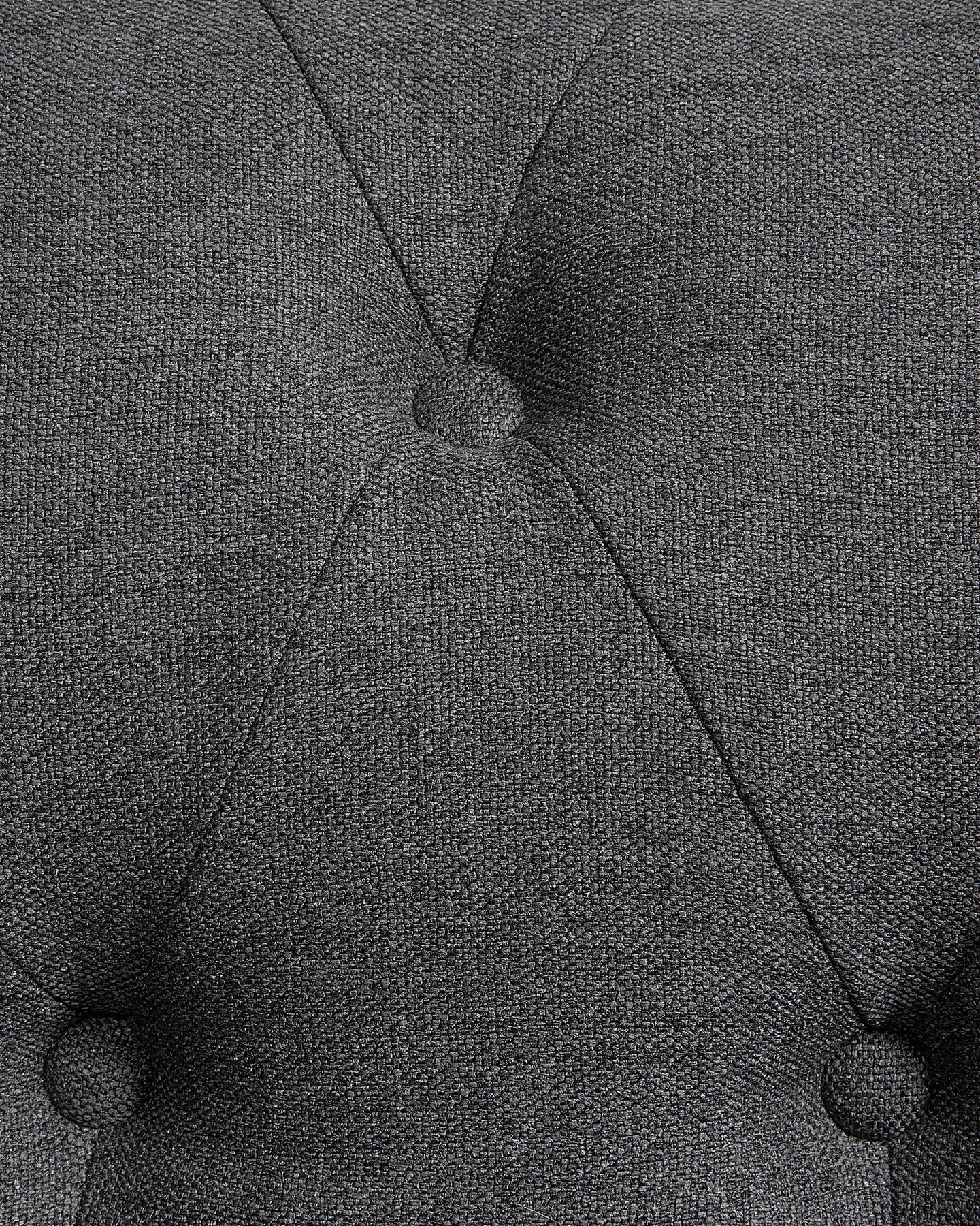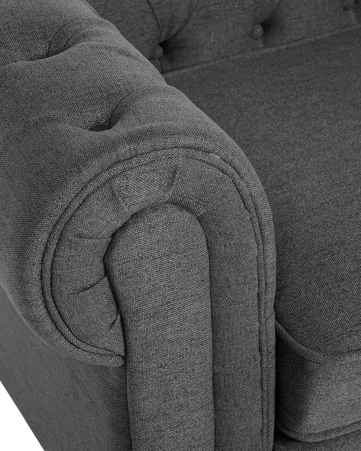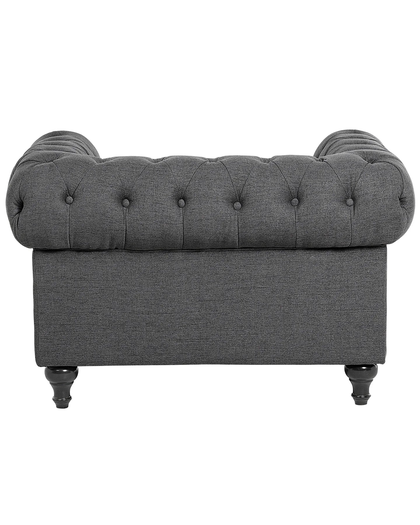 Characterised by a sweeping silhouette with wide scroll arms, this armchair comes in an iconic Chesterfield style that suits any modern or traditional interior. The low backrest, as well as soft, thickly padded seat cushions, provides excellent sitting comfort. Upholstered in a grey fabric, the seat features classic diamond button tufting. This English classic is easy to care for and looks great with any decor.