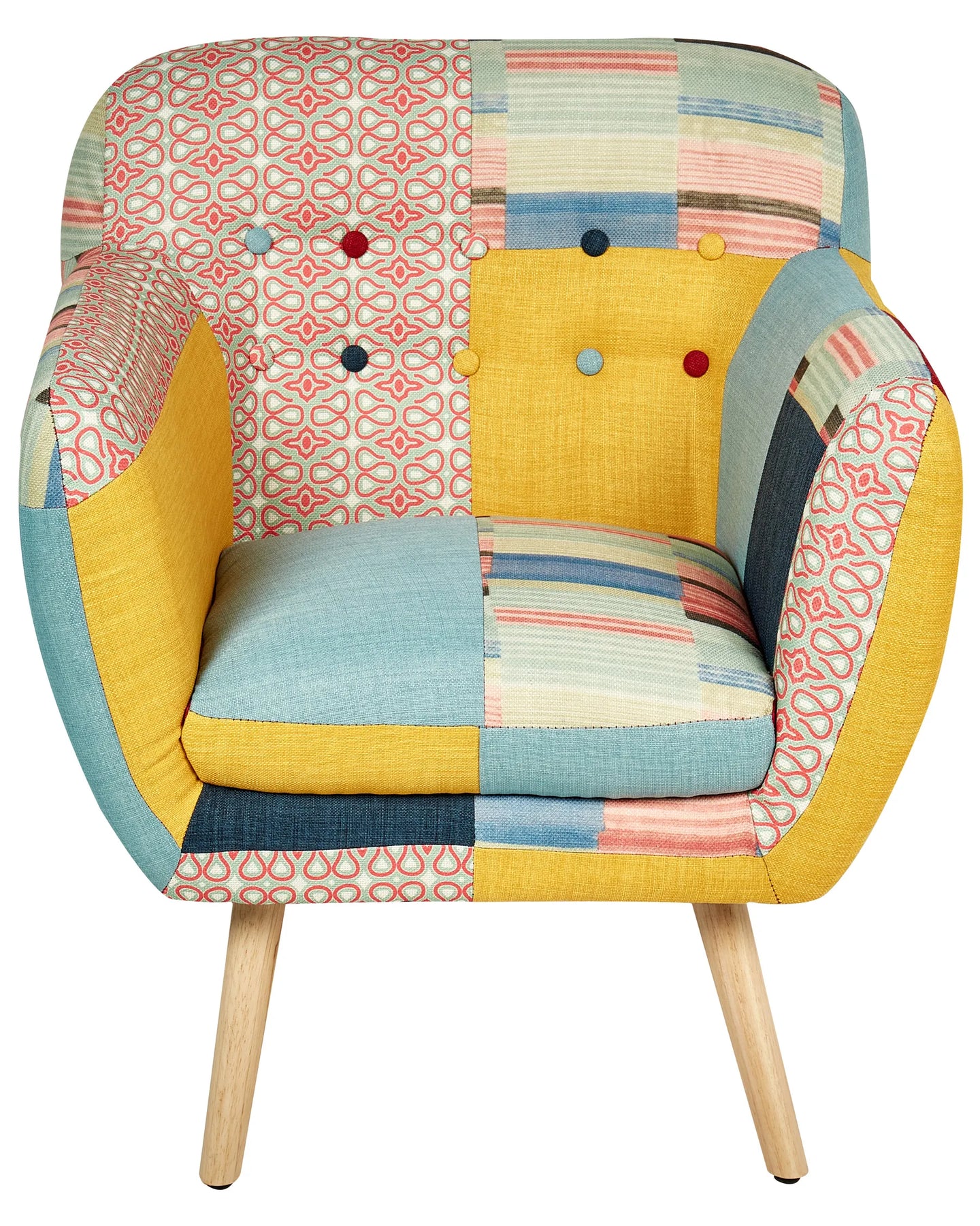 Brighten up your living room interior with the living room accent chair. Crafted with precision using solid rubber wood and top-grade polyester, ensuring sensational quality that lasts for long. The thickly padded, deep seat with button-tufted backrest and high armrest provide absolute seating comfort, making the chair a marvellous relaxation spot, especially suitable for living rooms with mid-century modern or eclectic decors.
