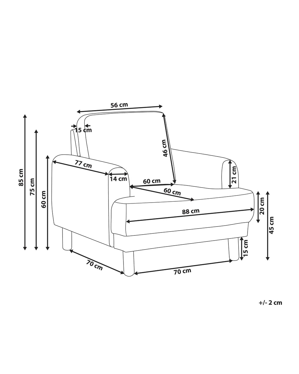 This upholstered armchair is going to be a focal point of your living space. Crafted out of durable, high quality polyester fabric, in timeless off-white colour, the piece will draw attention with its clean-lined design, thickly padded seat and buttoned backrest cushion. Additionally, the whole construction is placed on a set of wooden legs, which will highlight the retro design of the piece and guarantee stability.