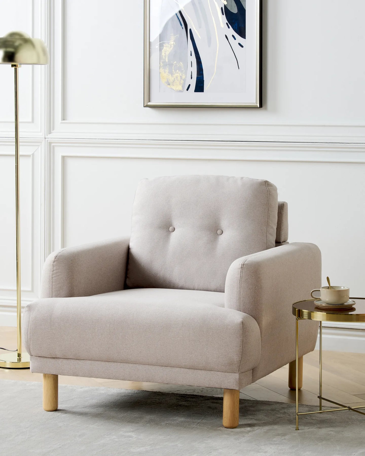 This upholstered armchair is going to be a focal point of your living space. Crafted out of durable, high quality polyester fabric, in timeless taupe beige colour, the piece will draw attention with its clean-lined design, thickly padded seat and buttoned backrest cushion. Additionally, the whole construction is placed on a set of wooden legs, which will highlight the retro design of the piece and guarantee stability.