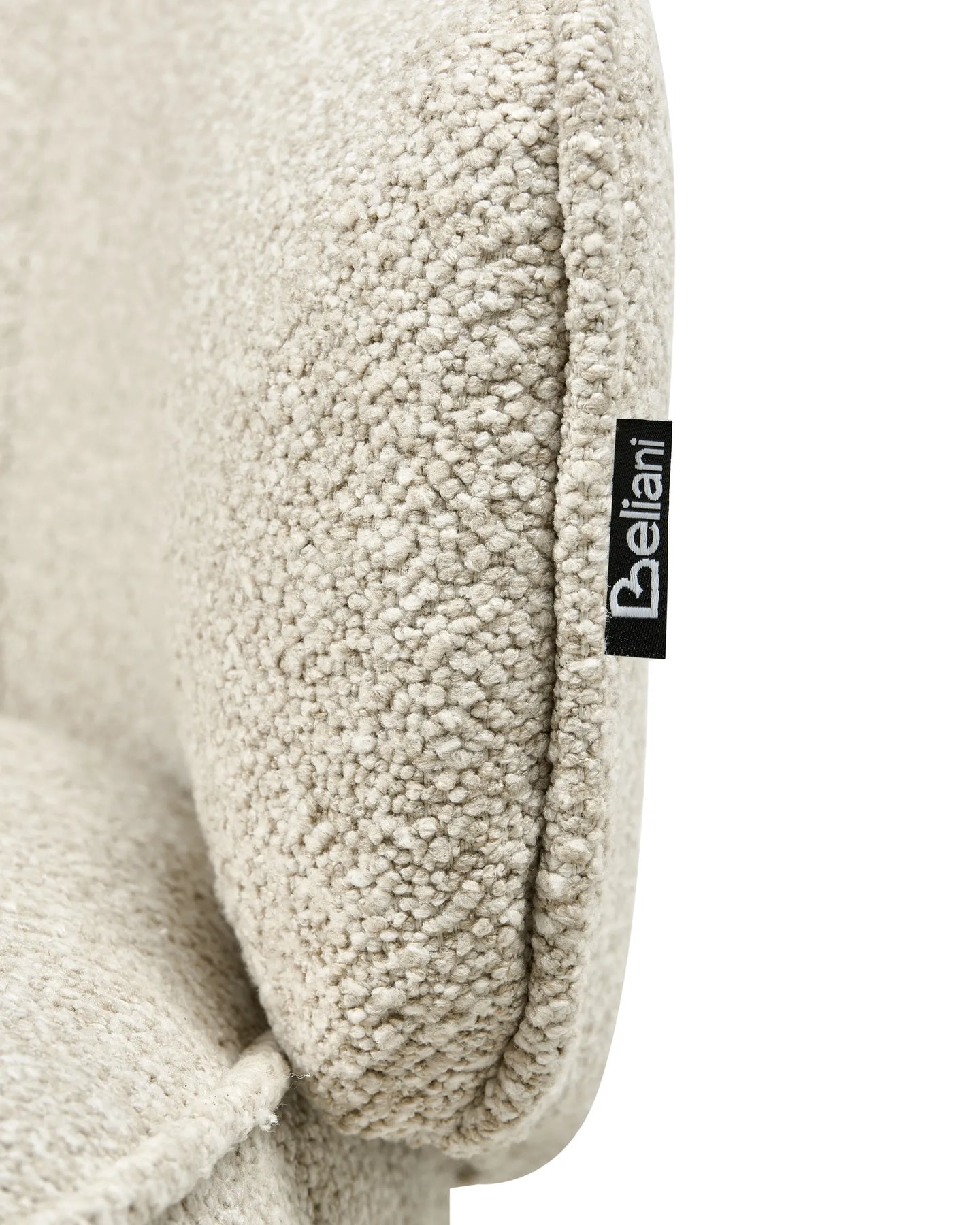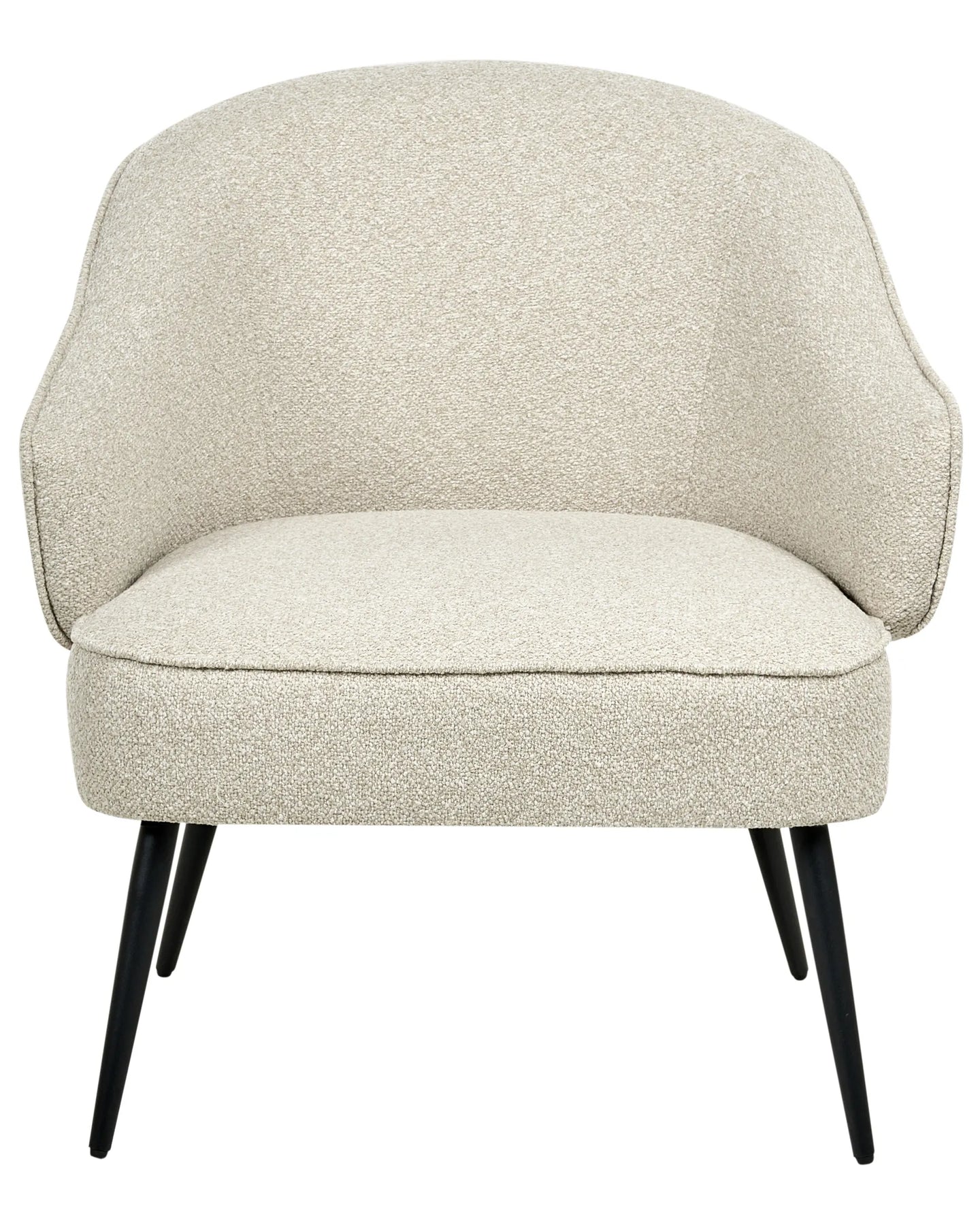 This armchair is a comfortable and visually appealing addition to any living room. Upholstered in soft light beige bouclé fabric, the rounded seat and backrest offer both support and a cosy look. The powder-coated metal legs ensure stability and add a subtle visual contrast. It fits well into modern or industrial interiors. Perfect as an extra seating option or a decorative piece in your relaxation area.