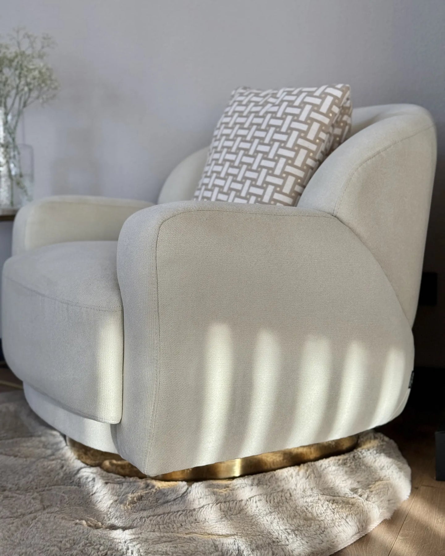 Add a touch of elegance to your space with this chic armchair. Designed with a sleek golden base, it offers both stability and style. The plush seat and supportive arms are upholstered in high-quality, water-repellent fabric, ensuring durability and easy maintenance. Perfect for living rooms and bedrooms, it combines comfort with timeless sophistication.