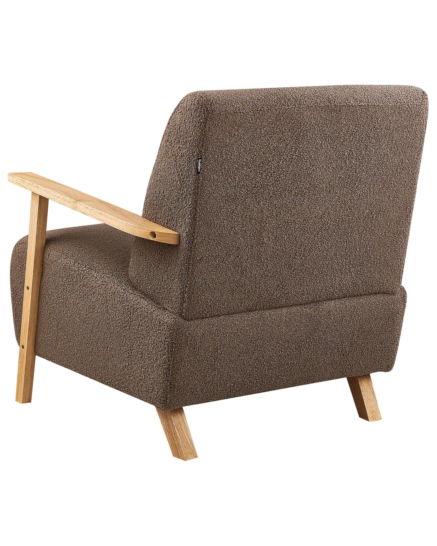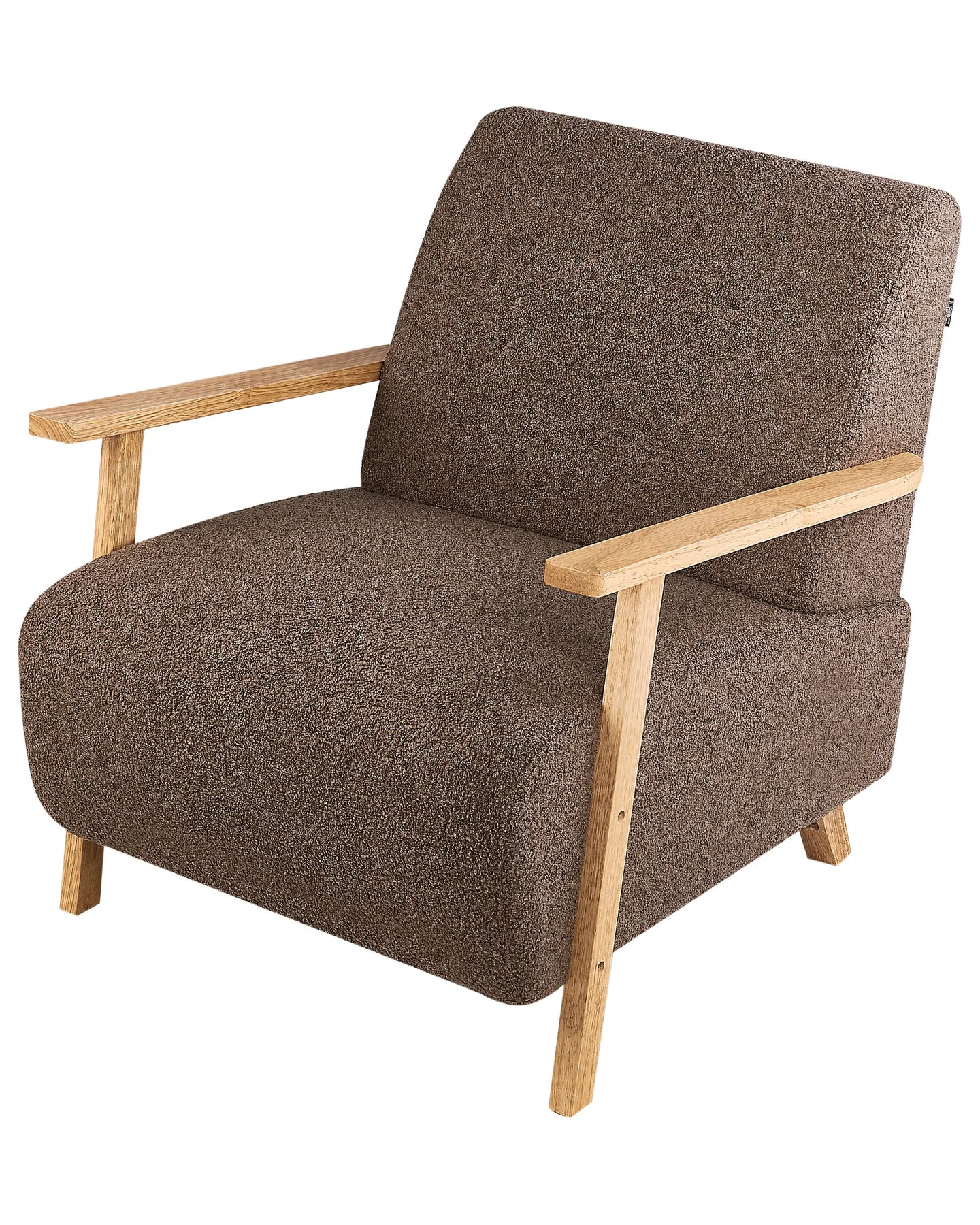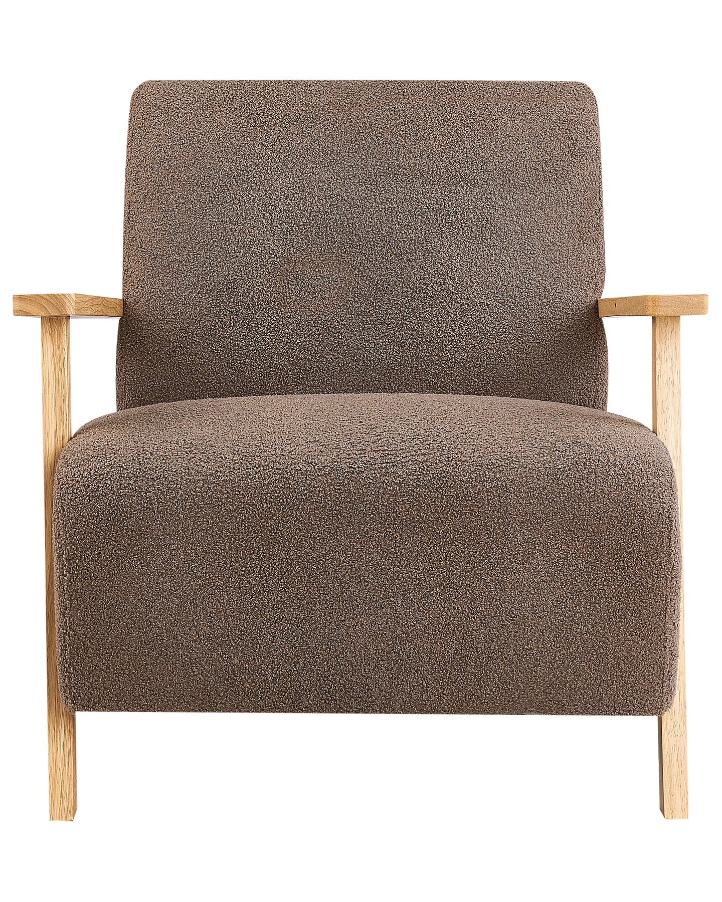 This retro-style upholstered armchair is a perfect place to unwind and relax. Armrests and legs crafted from eucalyptus wood add stability, and soft boucle upholstery in a light colour provides you with additional comfort. Its simple and classic design makes it a truly universal piece that will add a cosy touch to your space.